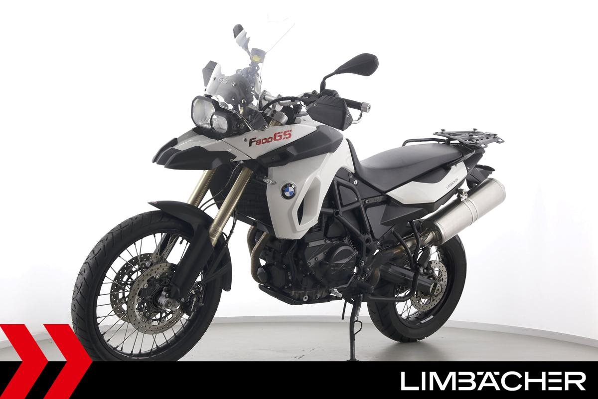 Eine BMW F 800 GS in gebrauchtem Zustand u.a. mit Drosselung auf 35 kW und Gepäckbrücke.