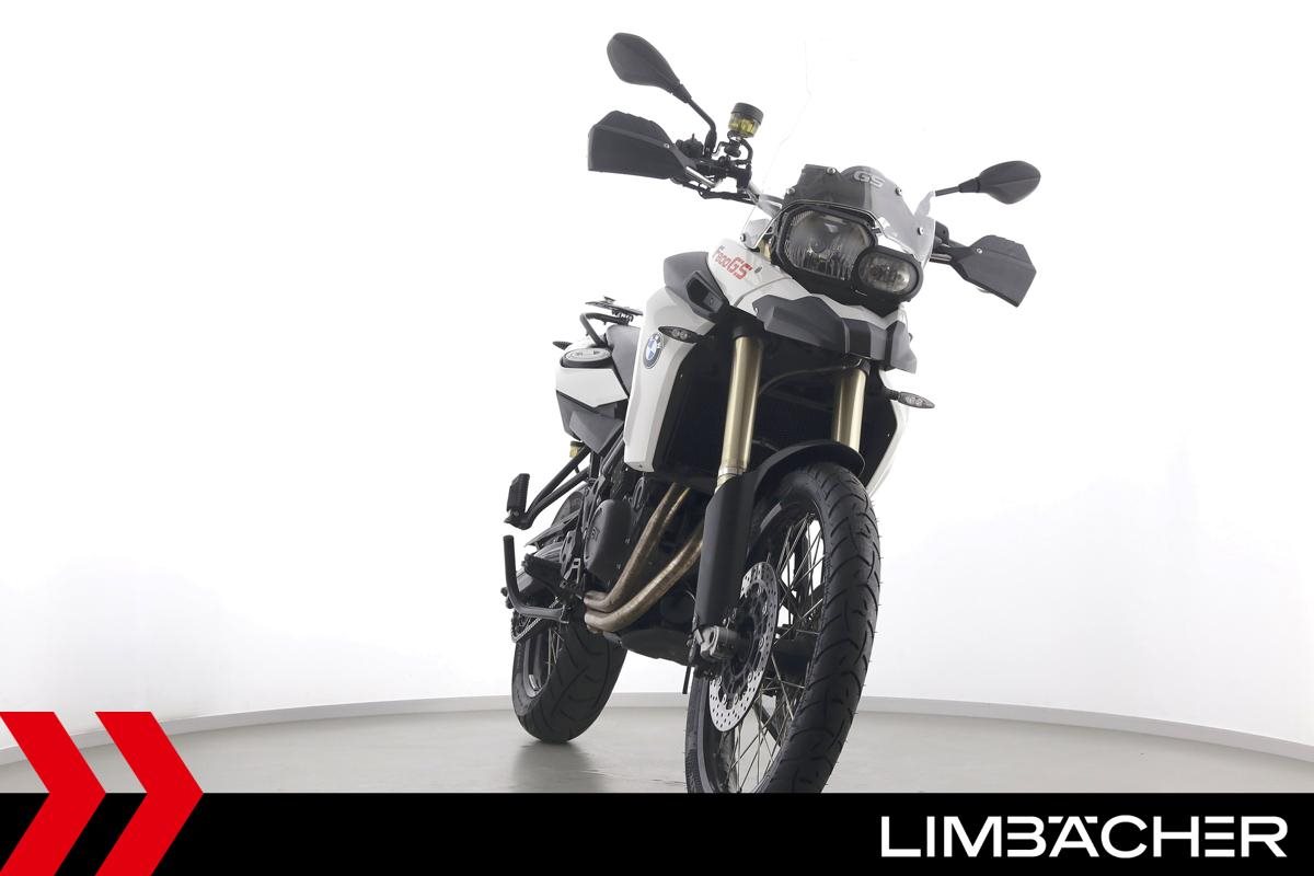 Eine BMW F 800 GS in gebrauchtem Zustand u.a. mit Drosselung auf 35 kW und Gepäckbrücke.
