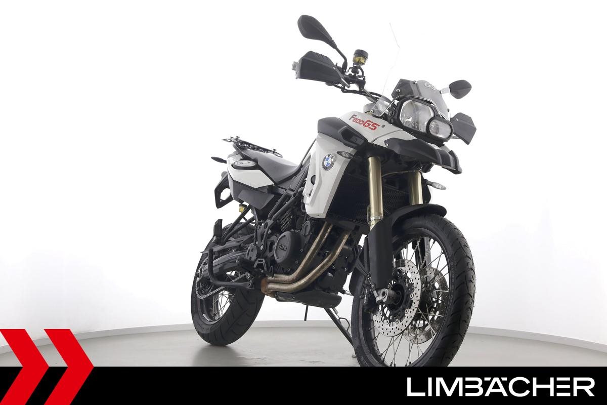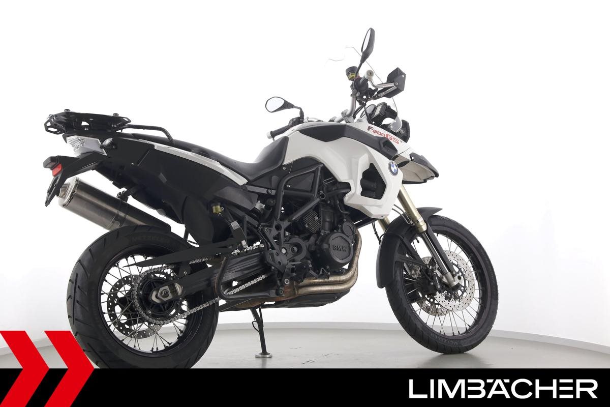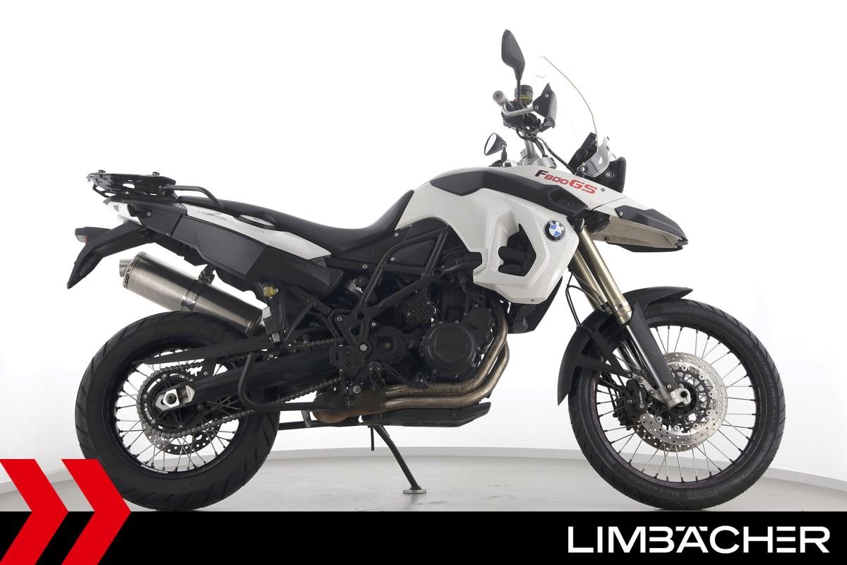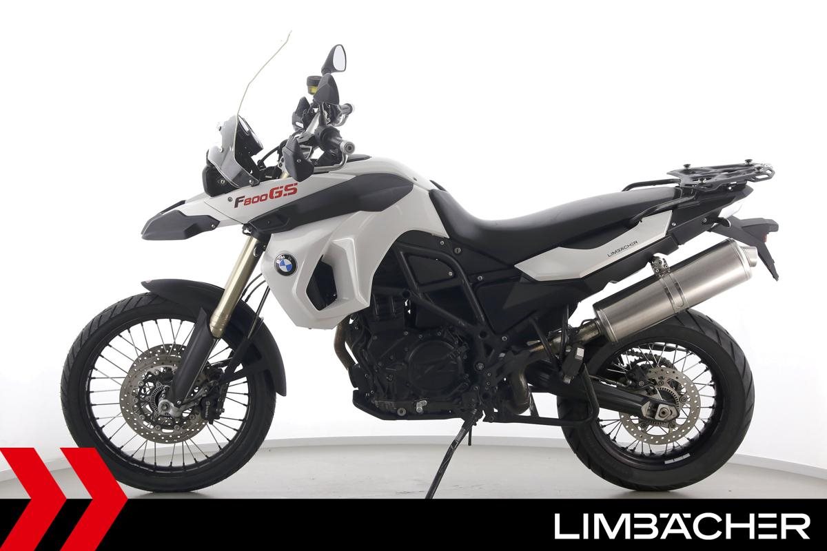 Eine BMW F 800 GS in gebrauchtem Zustand u.a. mit Drosselung auf 35 kW und Gepäckbrücke.