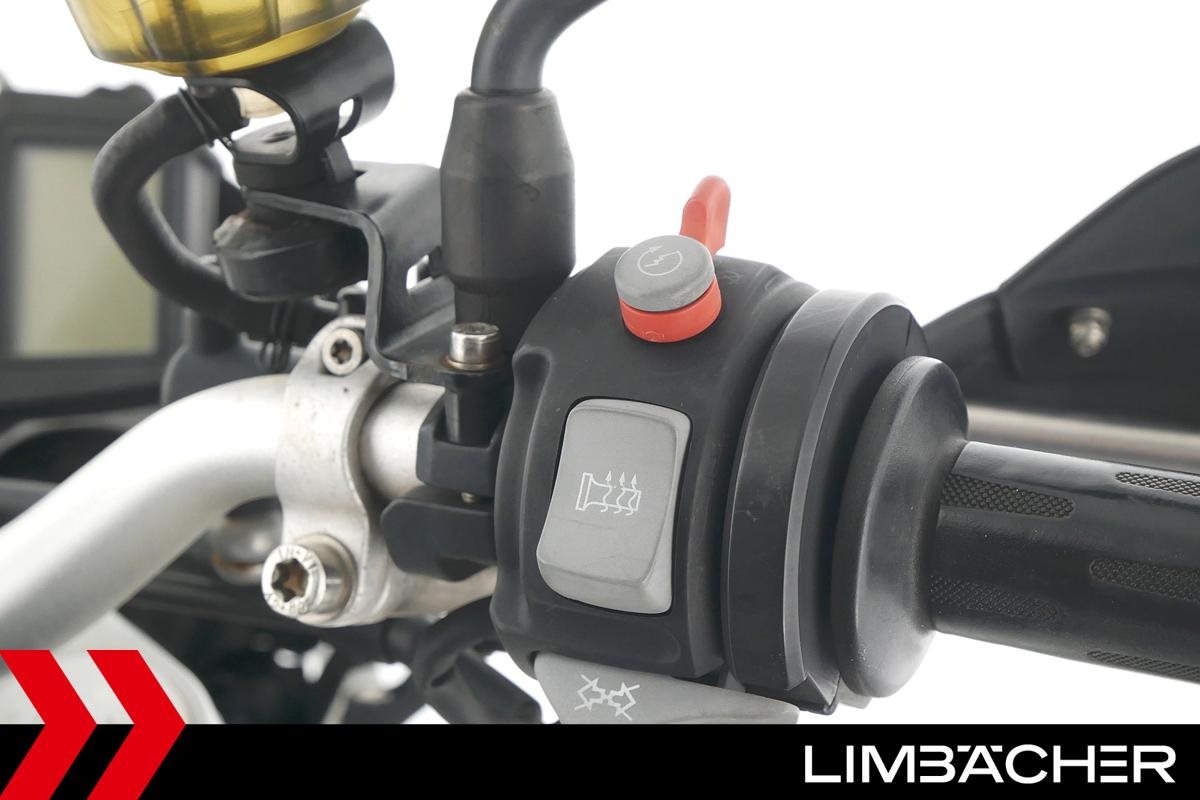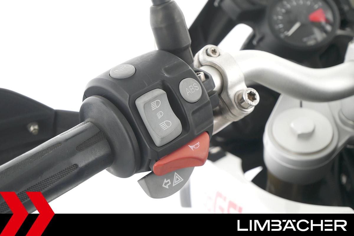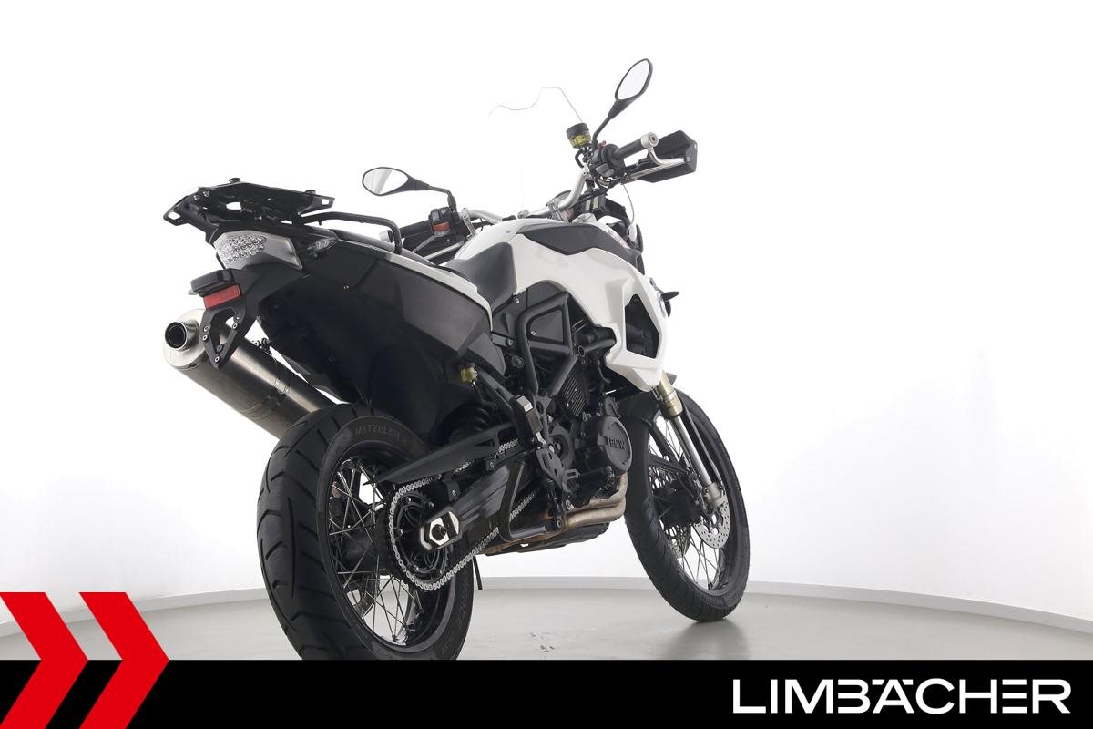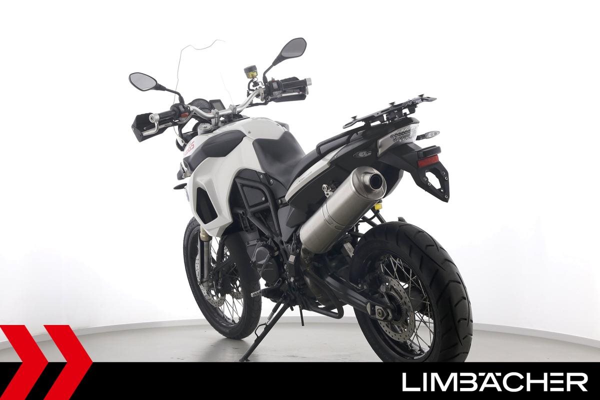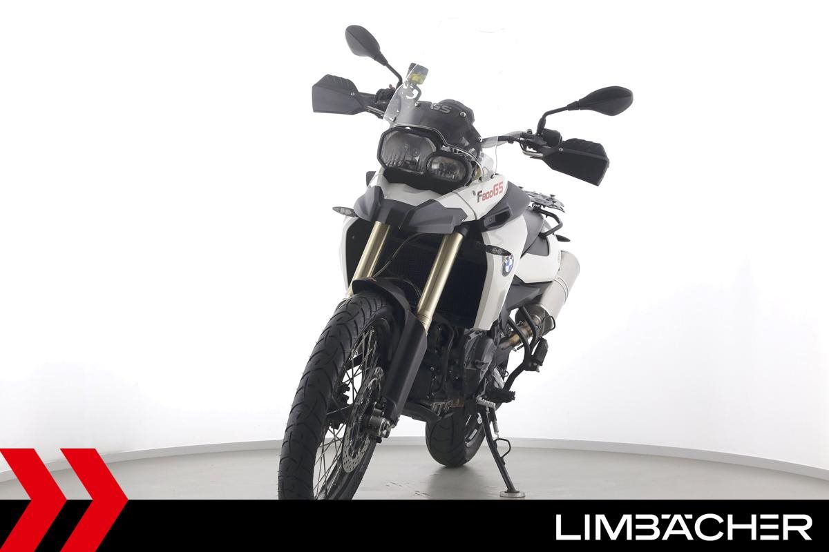 Eine BMW F 800 GS in gebrauchtem Zustand u.a. mit Drosselung auf 35 kW und Gepäckbrücke.