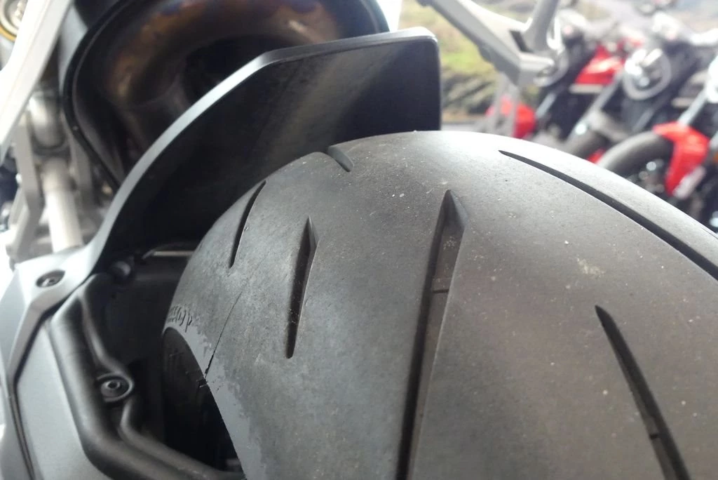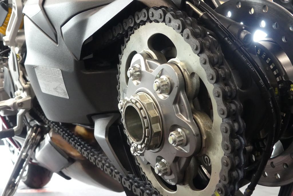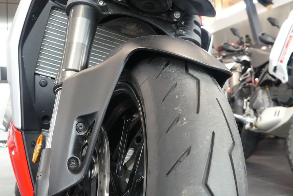 2 x Ø 320 mm halbschwimmend gelagerte Bremsscheiben, radial verschraubte Brembo Monoblock M4.32 Bremssättel, 4-Kolben Bremszangen, Kurven-ABS EVO, selbstentlüftende Bremspumpe