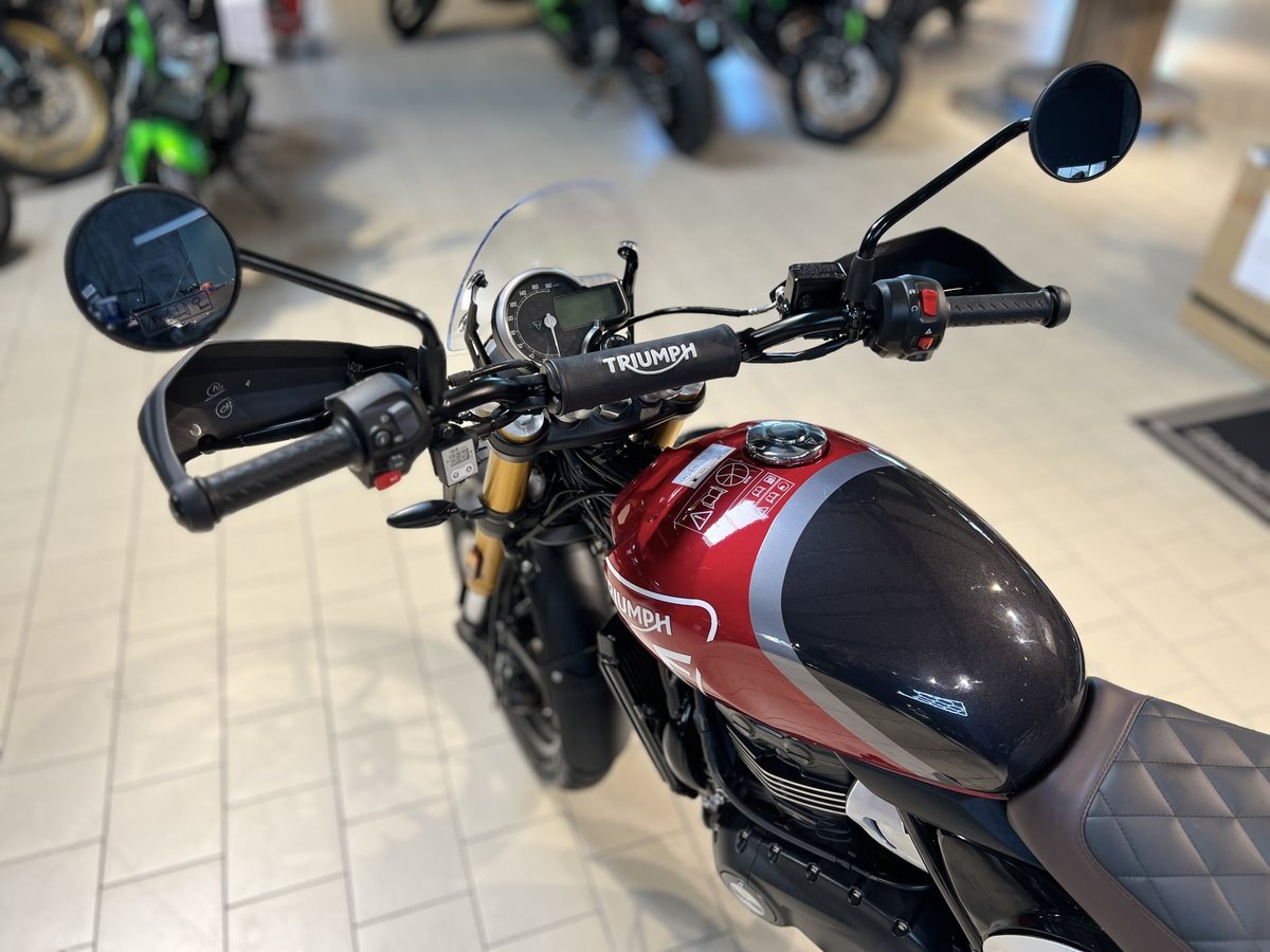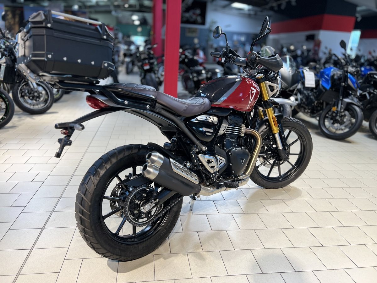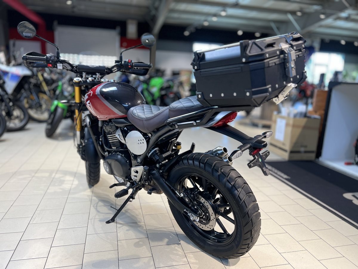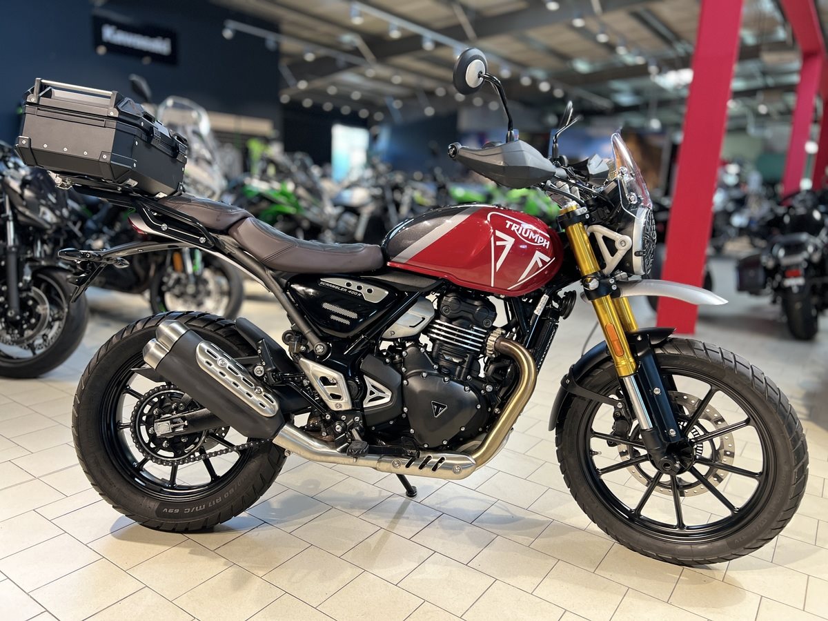 TRIUMPH SCRAMBLER 400 X Verkauft wird hier eine top gepflegte Triumph Scrambler 400 X aus seriösem Erstbesitz. Die schöne Triumph hatte mit dem verbauten Zubehör einen Neupreis von 8.300. Das montierte Zubehör ist weiter unten aufgelistet. Das Fahrzeug wurde beim Triumph Vertragshändler in Braunschweig erworben und in deren Meisterwerkstatt mühevoll mit reichlich Zubehör ausgestattet. Die Triumph ist scheckheftgepflegt und hat gerade einen frischen Service. Somit ist die Scrambler bereit für bevorstehende Ausfahrten und Abenteuern. Die Triumph hat noch Herstellergarantie bis 02/2028! Servicehistorie 1. Wartung am 15.02.2024 bei 1.047 km 2. Wartung am 21.02.2025 bei 8.984 km Verbautes Zubehör - Gepäckträger (185) - Hoch angebrachter Kotflügel (159) - Beschichtetes Windschild inkl. Montagesatz (122) - Gesteppte Fahrer - & Soziussitzbank (265) - Ölwannenschutz (175) - Topcase Bagtax XB22L (126) - CLS Kettenöler standard (399) - Halteplatte CLS gelagert / schwarz pulverbeschichtet (38) - 4 Fahrzeugschlüssel (3 codiert , 1 nicht codiert)