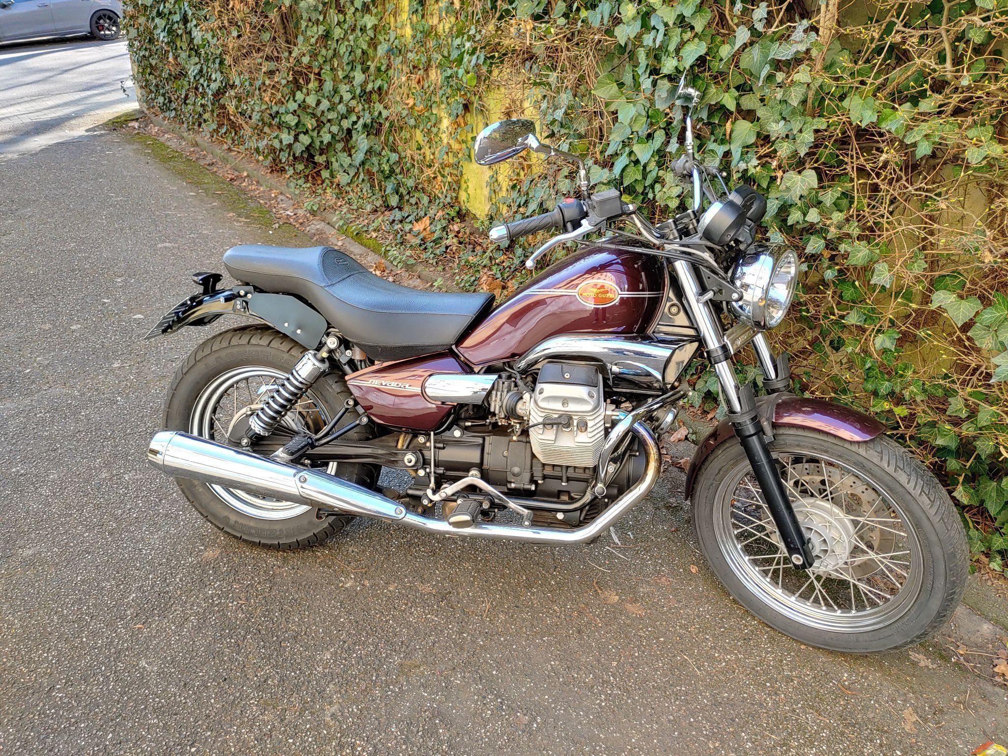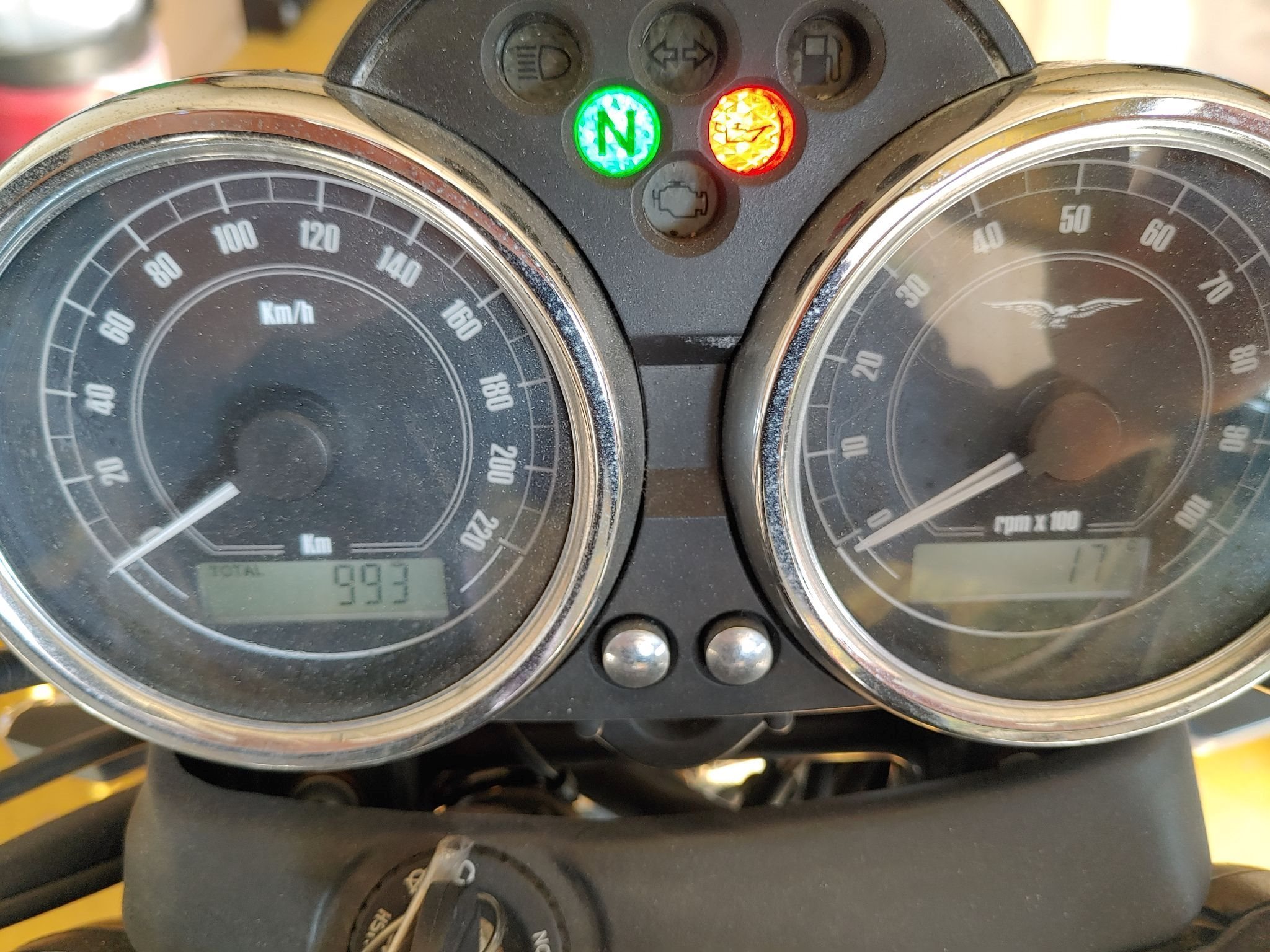 Moto Guzzi Nevada 750 Baujahr 2010 mit nur 993 km! Ich habe das Motorrad gekauft, alle Wartungsarbeiten wurden von mir, (20 Jahre als Mechaniker/Meister bei VW/Audi), durchgefuhrt: Neue Batterie, Motoröl, Getriebeöl, Kardanöl ,Bremsflüssigkeit usw. Am Profil der originalen Reifen, Foto Nr. 11 ( siehe DOT Woche 47 Jahr 2008 ), kann man sofort sehen, dass das Reifenprofil wie neu ist (nur 993 km gefahren )! An den Bremsscheiben und Bremsbelaegen sieht man das auch ( so gut wie kein Verschleiß). Der Motor springt sofort an und läuft wie ein Uhrwerk und sehr leise!! Das Heck habe ich durch einen kurzen Heck ersetzt, Umbau auf original ist in ca. 30 Minuten erledigt, ( original Teile werden mitgegeben),