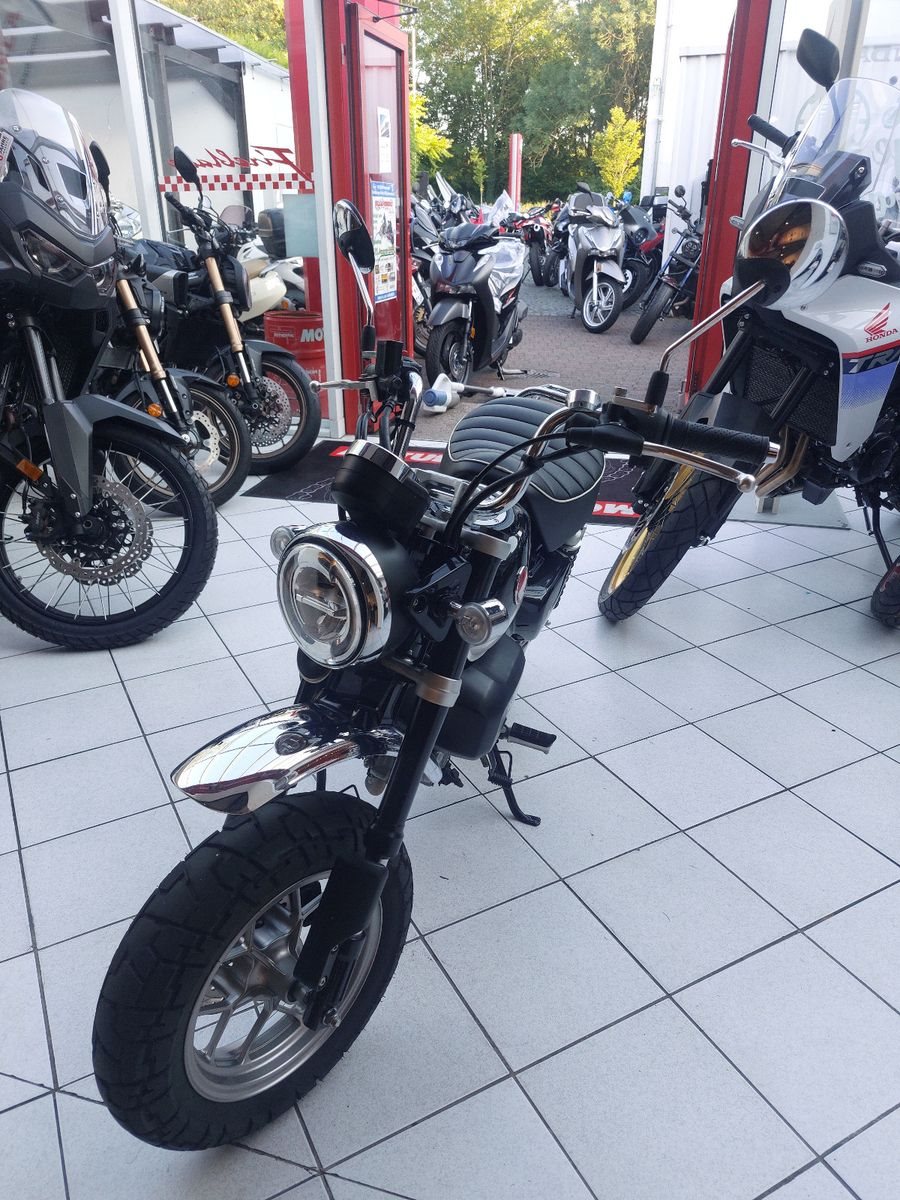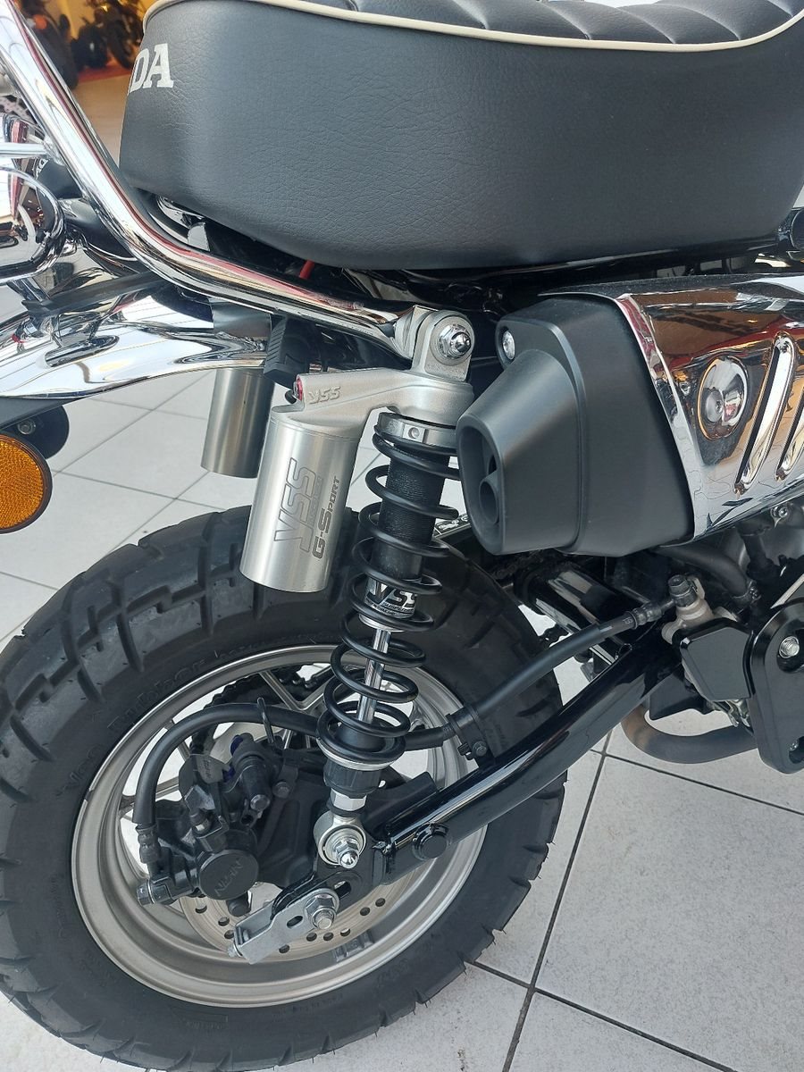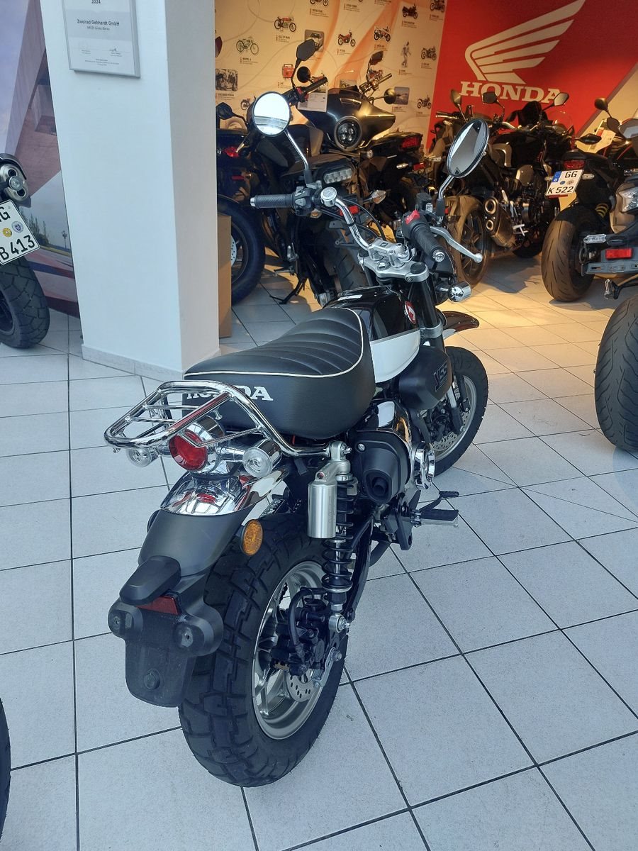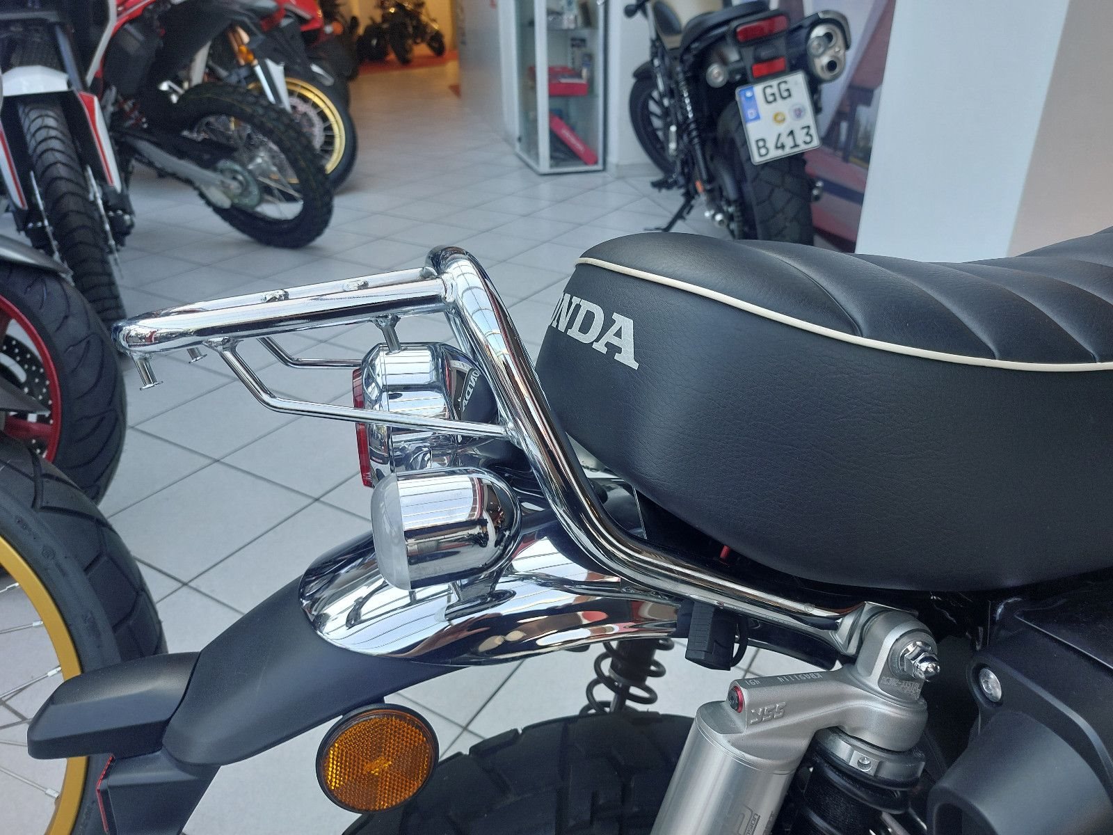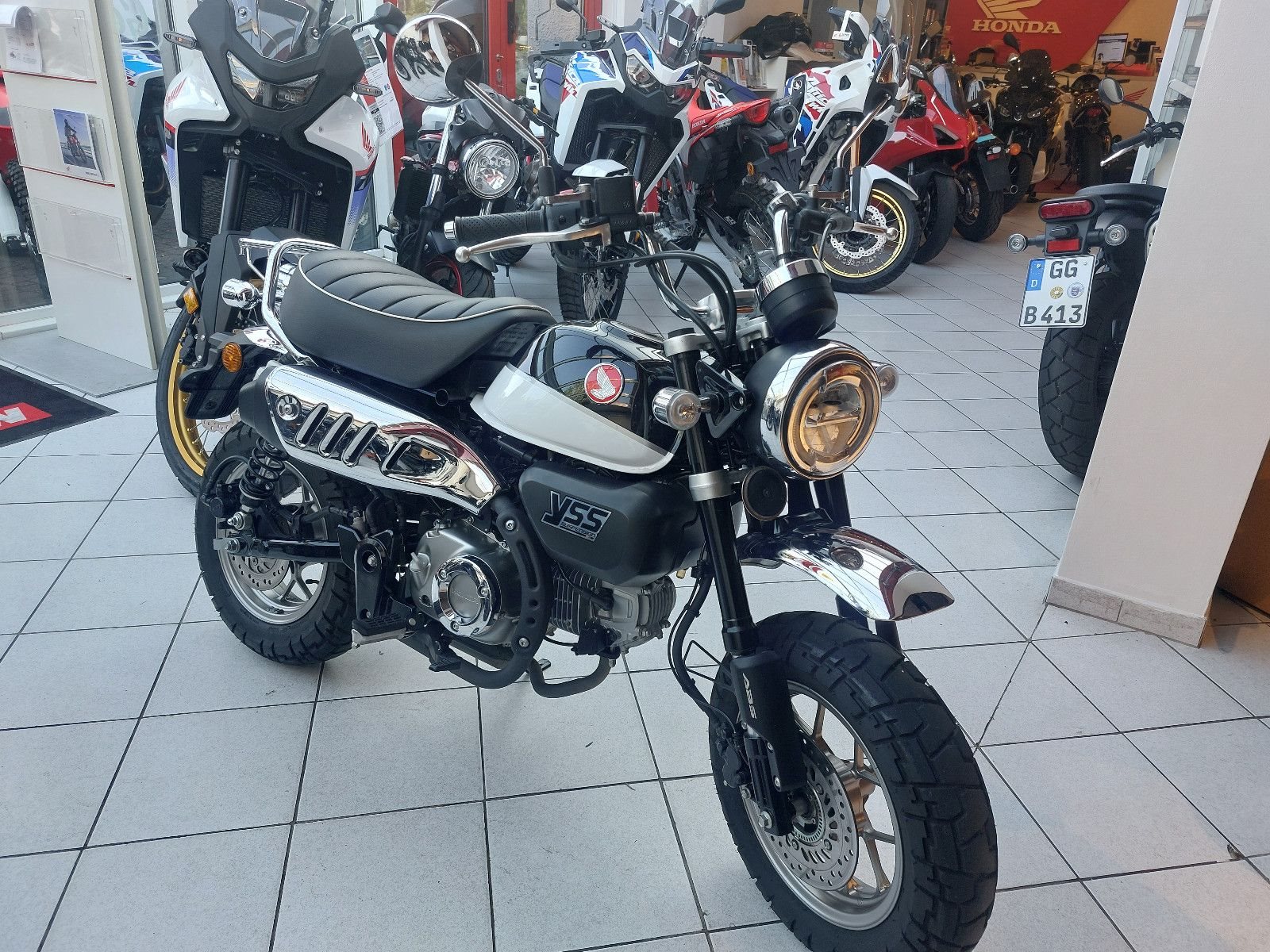 Honda Z125 Monkey, schwarz, Gebrauchtfahrzeug, ABS (nur vorne), YSS Federbeine hinten, Gepäckträger, Spiegelverbreiterungen, Euro 4, CO2 kombiniert 35g/km, Benzinverbrauch gemäß WMTC 1,5l/100km, 4 Gang Getriebe, Gewicht vollgetankt 107 kg.