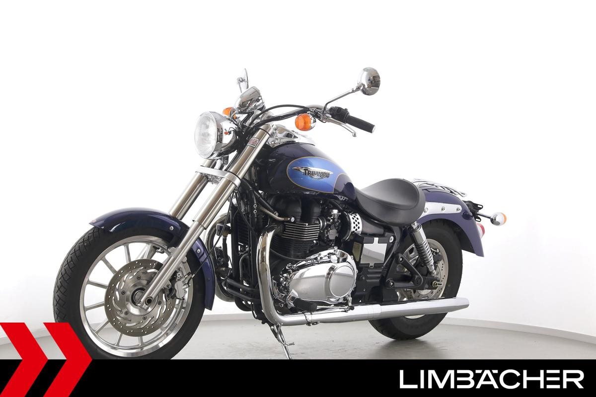 Eine Triumph America in gepflegtem Zustand mit Gepäckträger.