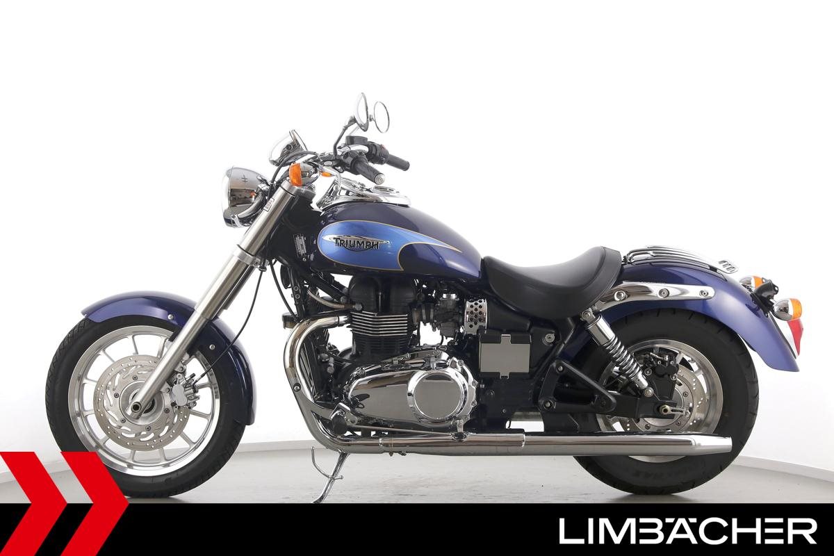 Eine Triumph America in gepflegtem Zustand mit Gepäckträger.