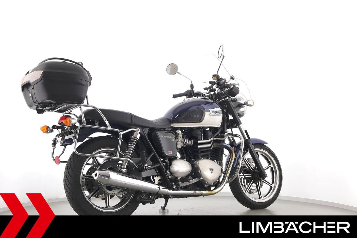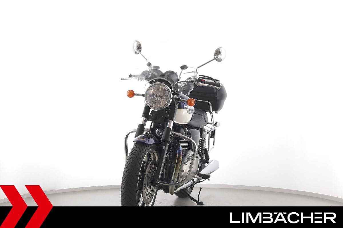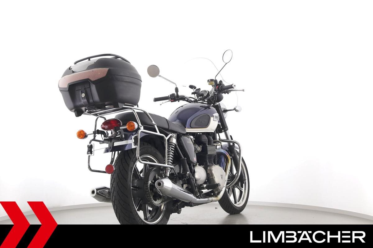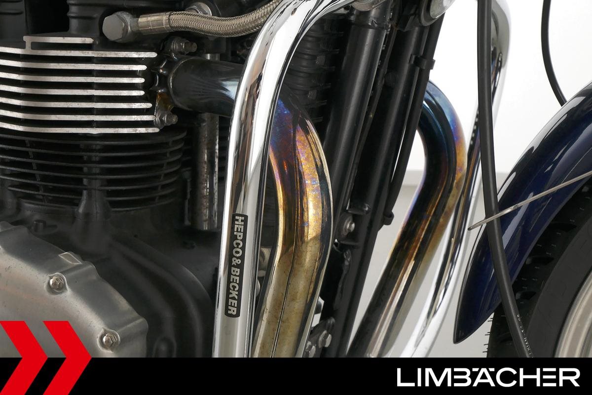 Eine Triumph Bonneville T100 SE aus zweiter Hand in gepflegtem Zustand u.a. mit Hepco & Becker-Sturzbügel und Hepco & Becker-Topcase.