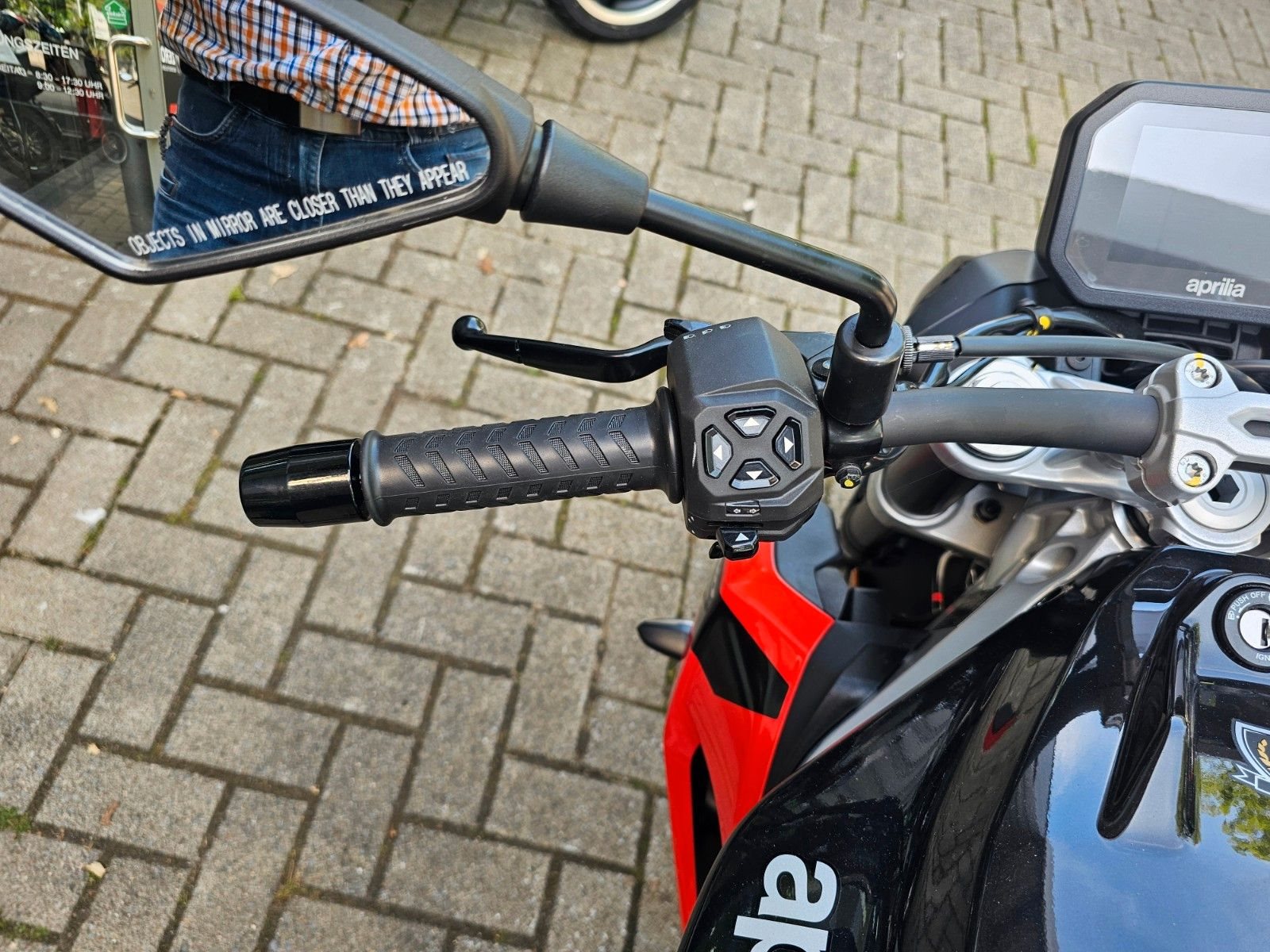 • High-Tech-Fahrspaß Mach dich bereit für ein einzigartiges Fahrerlebnis mit der Aprilia Tuono 457, dank ihrer Technologie, die dir maximale Kontrolle und maximalen Spaß bietet. Das Ride-by-Wire-System, das Aprilia als Erste in der MotoGP eingeführt hat, stellt dir drei Riding Modes zur Verfügung, die du auf deinen Fahrstil abstimmen kannst. Jeder Modus optimiert Leistung, Drehmoment und Traktionskontrolle - letztere lässt sich in drei Stufen sogar während der Fahrt einstellen. Du willst den Modus wechseln? Nutze einfach die hintergrundbeleuchteten Bedienelemente am Lenker, um alles auf dem modernen 5-Zoll-TFT-Farbdisplay anzuzeigen.