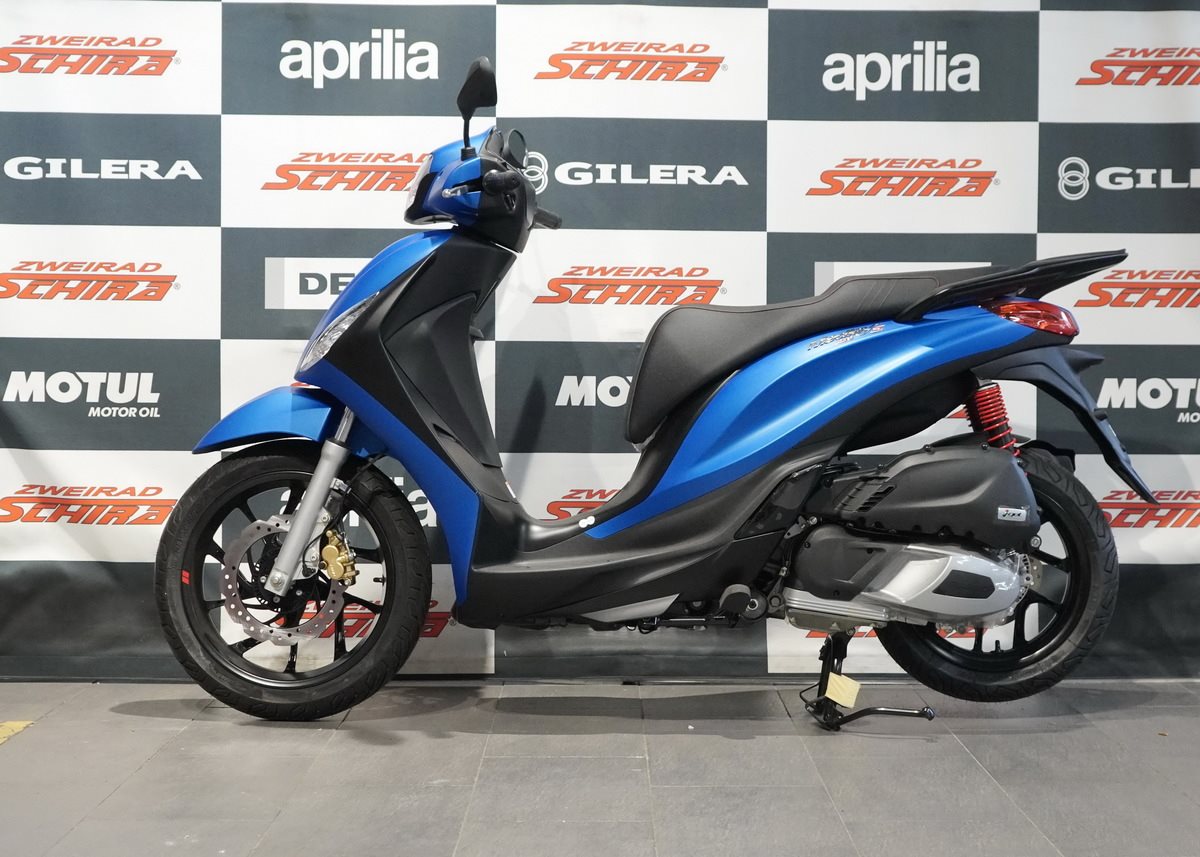 Die ganze Sportlichkeit des Piaggio Medley S zeigt sich in einem mutigen und eleganten Design, das durch die komplett schwarze Lackierung in allen Details, die kontrastierenden blauen Aufkleber auf den Felgen und die unverwechselbare Krawatte mit Wabenstruktur vervollständigt wird. Die raffinierte und schützende Frontpartie und die schlanken Linien des Hecks schaffen ein perfektes Gleichgewicht zwischen sportlichem Charakter und Praktikabilität. Die tiefen Töne und die matte Farbgebung unterstreichen die entschlossene Persönlichkeit des Piaggio Medley S, der bereit ist, seinen Stil auf jeder Fahrt zu entfesseln.