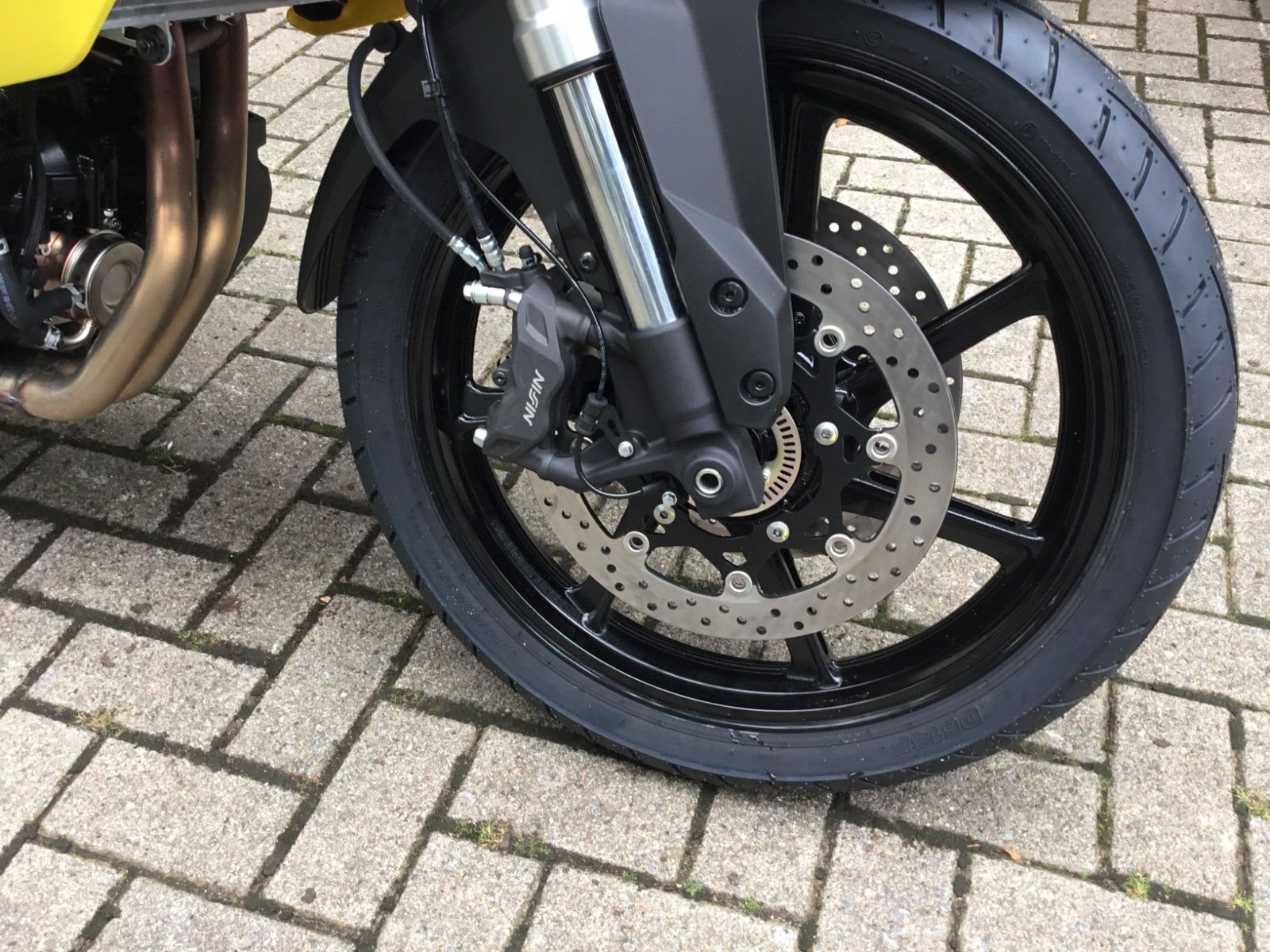 Mit ihrem 19-Zoll-Vorderrad und den leichten Gussrädern im Sieben-Speichen-Design folgt die V-Strom 800 jedem Deiner Lenkimpulse mit spontaner Präzision. Für sportlichen Grip und Stabilität bei hohem Speed verbürgen sich die eigens entwickelten Dunlop Reifen. Damit Du stets sicher zum Stehen kommst, nehmen die Vierkolben-Radialsättel die Doppelscheibe kraftvoll in die Zange.