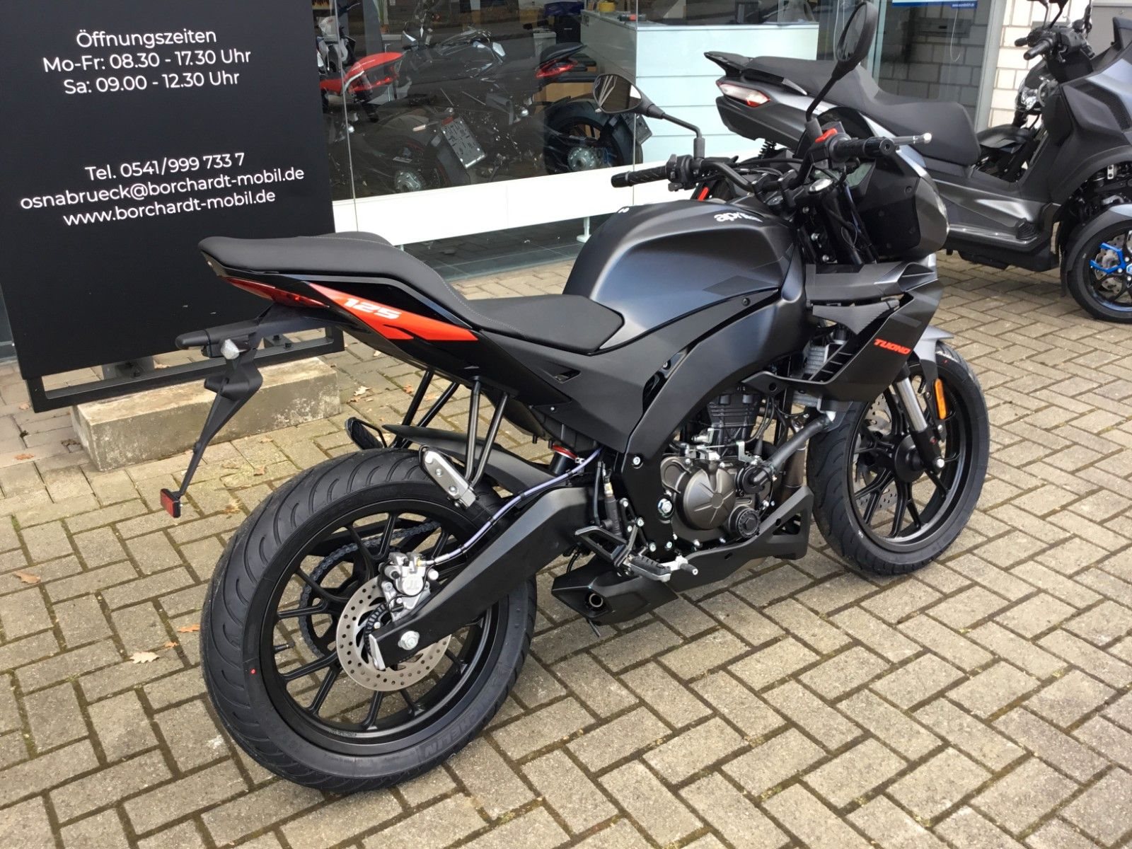 - Vielseitigkeit und große Reichweite Die Aprilia Tuono 125 bietet den viel Reichweite in ihrer Klasse dank 14,5 Liter Tank sowie ein geräumiges Staufach unter der Sitzbank, das Platz für beispielsweise ein Tablet bietet. Dieses kann bei Bedarf über die als Option erhältliche USB-Ladebuchse aufgeladen werden.