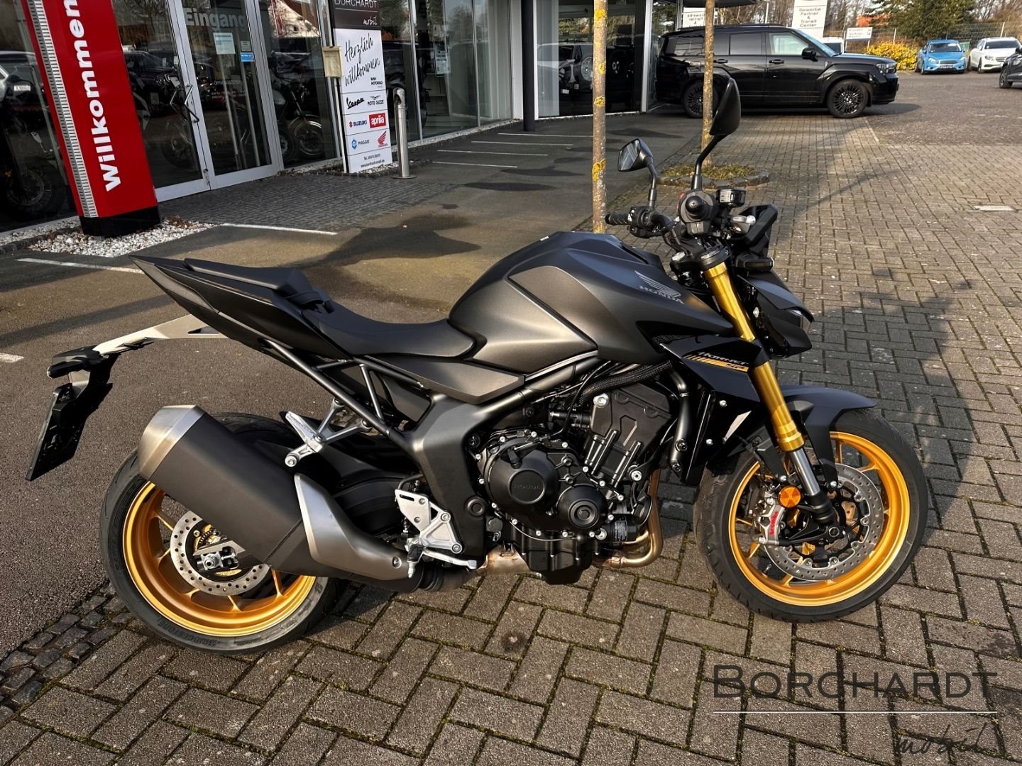 Die Hornet-Familie ist jetzt vollständig und unser Topmodell sticht heraus. Die neue CB1000 Hornet mit ihrem Vierzylindermotor ist ein erstklassiges Naked Bike, das den Asphalt zum Glühen bringt. Throttle By Wire sorgt für präzise Kontrolle, während das Fahrwerk mit der einstellbaren SHOWA 41mm SFF-BP Upside-Down-Gabel und dem Pro-Link-Federbein ausgestattet ist. Die unverfälschte, aggressive Streetfighter-Attitüde wird durch einen markanten LED-Doppelscheinwerfer unterstrichen. Das 5-Zoll TFT-Farbdisplay und die Honda RoadSync-Konnektivität sorgen für die nötigen Informationen. Kann es losgehen?