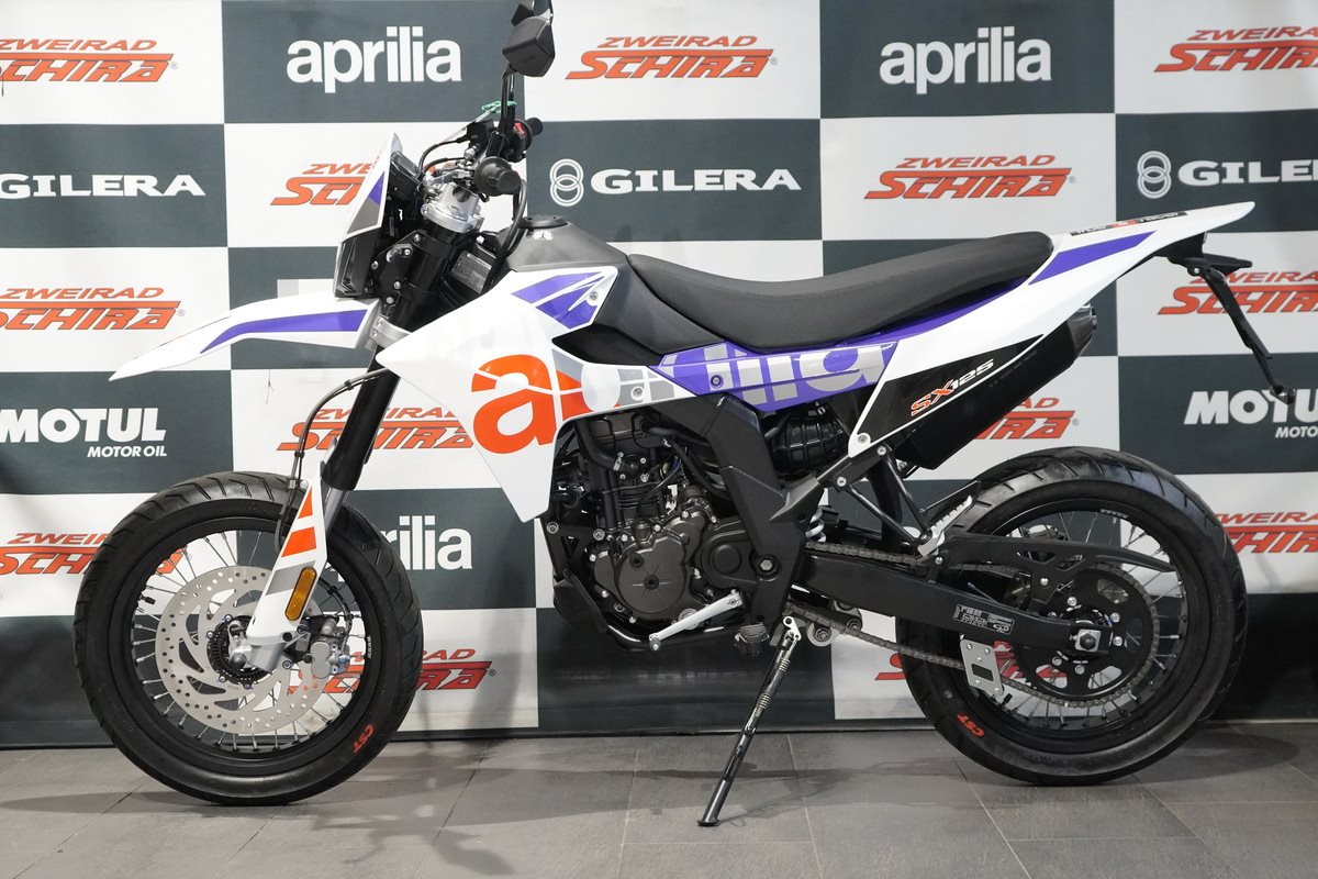 Die SX 125 ist leicht und präzise in der Handhabung und wird von einem modernen Einzylinder-Motor mit vier Ventilen und Euro 5+ Norm angetrieben, der über alle Drehzahlbereiche hinweg ein hervorragendes Drehmoment und eine hervorragende Leistung bietet. Präzision und Sicherheit in Kurven werden durch eine Dämpfung mit langem Federweg und ein Bosch-ABS mit Anti-Überschlag-Funktion gewährleistet, das beim Bremsen auf das Vorderrad einwirkt, um das Anheben des Hinterrads zu regulieren. Das Bremssystem verfügt über zwei schwimmend gelagerte Bremssättel: Der vordere mit zwei Kolben greift auf eine 300 mm Scheibe zu, während der hintere auf eine 218 mm Scheibe wirkt.