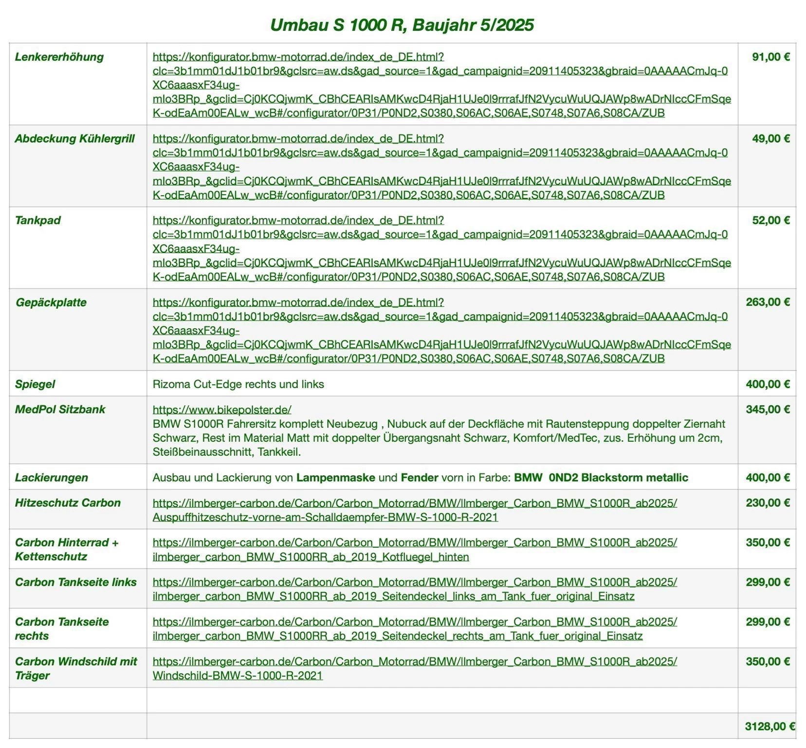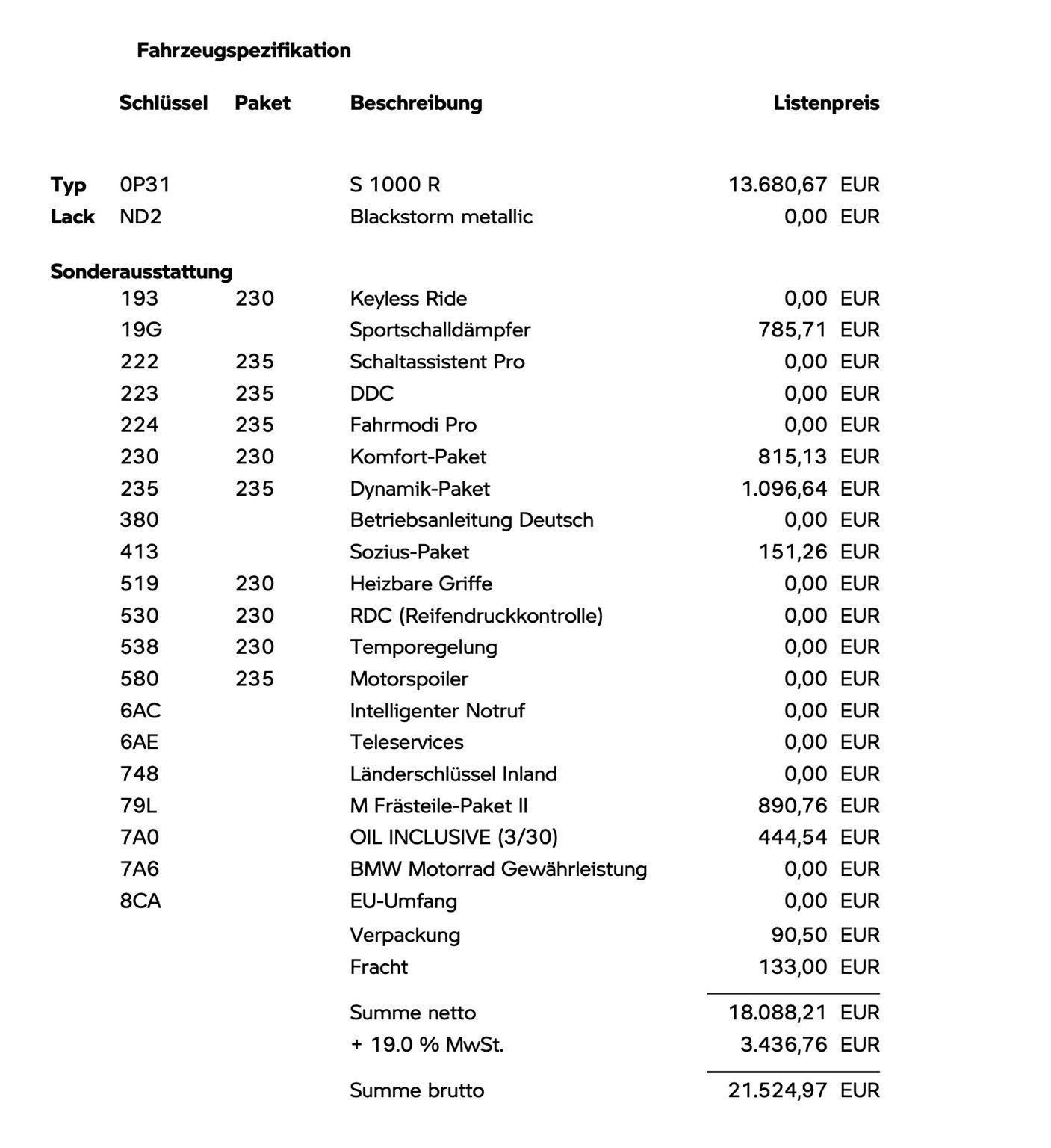 Die S1000R ist quasi neu (neuestes Modell, wurde im Mai erst gebaut, aktuell 2000km), ist vollgestopft mit allen Paketen (sogar Ölwechsel inclusive), Akrapovic von BMW und absolut top umgebaut. Die steht so mit Sicherheit bei keinem Händler. Anbei findet ihr die Ausstattungsliste und die Umbaumaßnahmen sowie einige Bilder.? Preislich ist es so, dass Maschine bei rund 21.500 € liegt und 3.200 € Umbaukosten (gerade abgeschlossen) drinstecken. Ich würde 6.000 € Nachlass geben, so dass ein Verhandlungspreis von 18.700 € entsteht. Die Umbaupreise sind mit Rechnungen belegt.? Ich möchte die Maschine verkaufen, da sie mir zu sportlich ambitioniert ist.? Bei Interesse können wir gern telefonisch mehr besprechen.