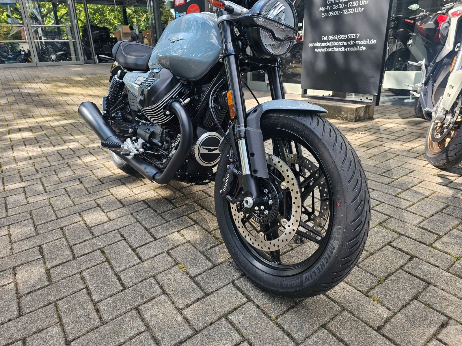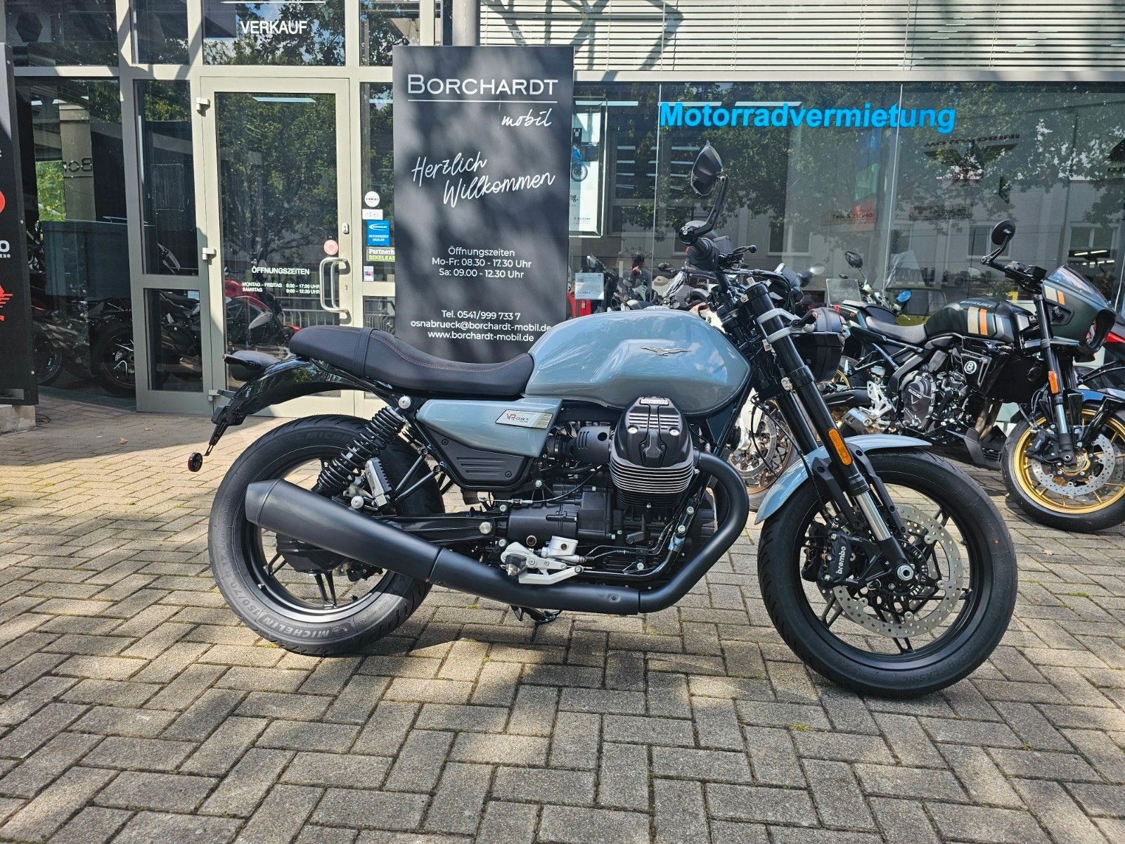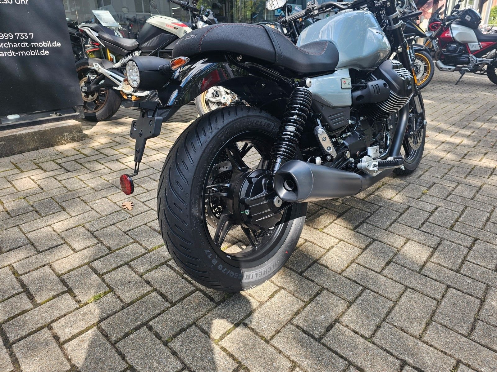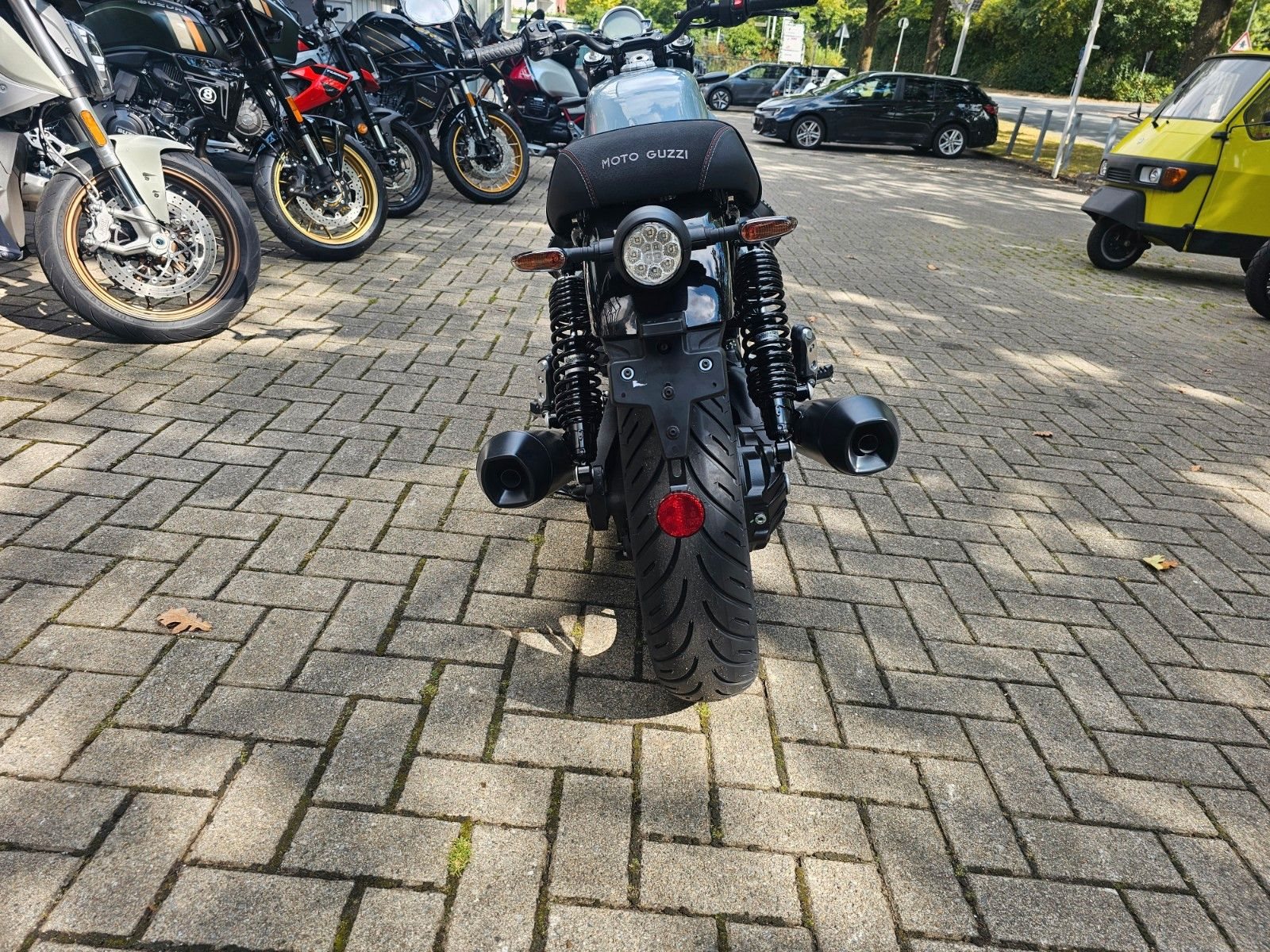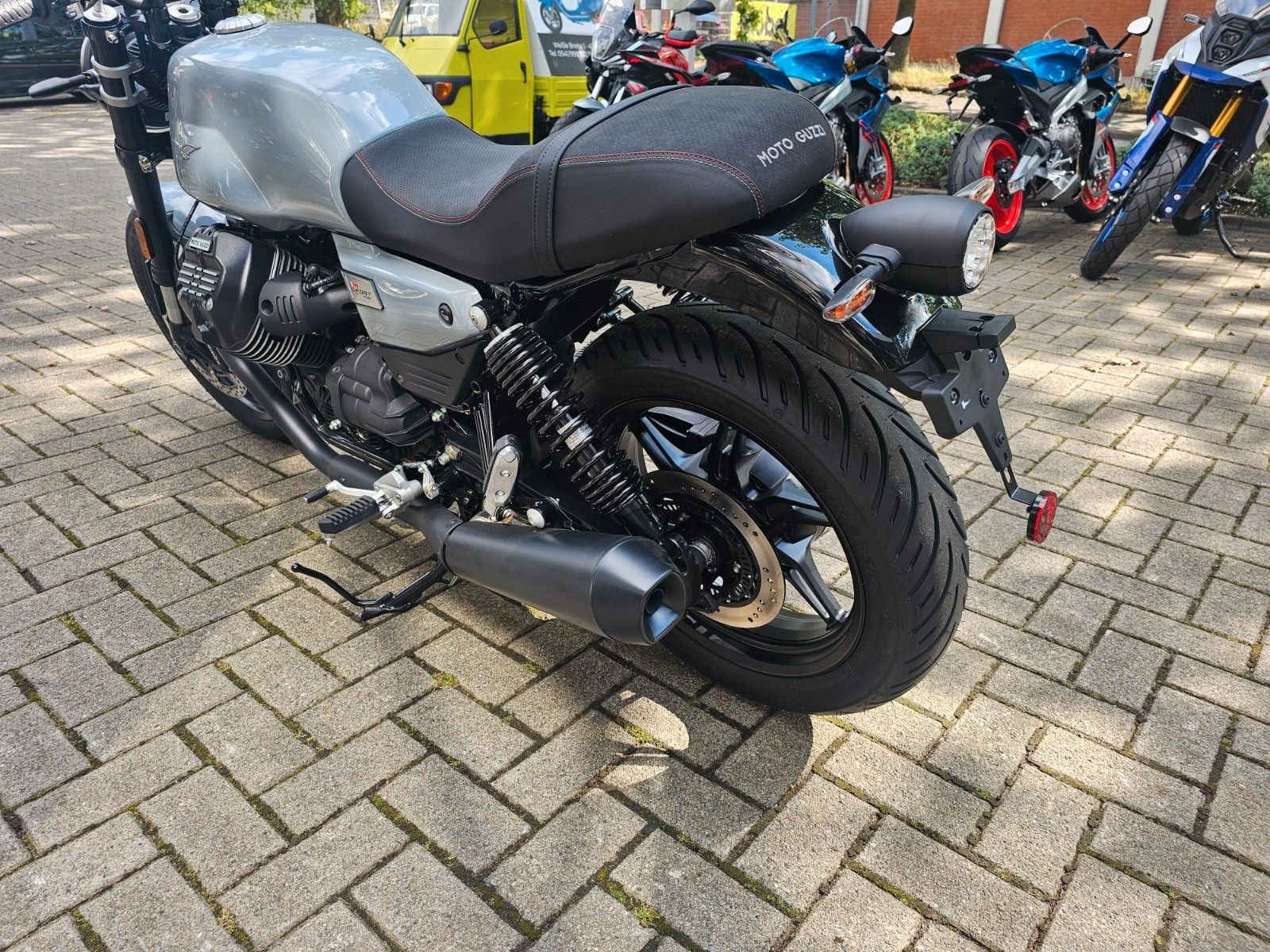 • Euro 5+ V-Twin Motor Der ikonische, luftgekühlte, längs eingebaute 90° V-Twin von Moto Guzzi erfüllt jetzt die Euro 5+ Norm. Mit einem Hubraum von 853 cm3 liefert er 67,3 PS bei 6.900 U/min und 79 Nm Drehmoment bei 4.400 U/min, für ein dynamisches und mitreißendes Fahrerlebnis, besonders bei niedrigen und mittleren Drehzahlen. Die vergrößerte Airbox, das neue Steuersystem und der optimierte Kolbenkühlkreislauf steigern Leistung und Effizienz.