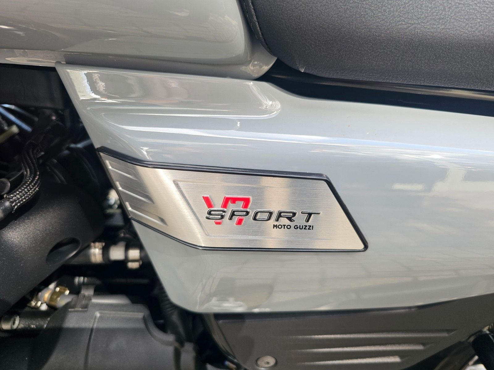 schwarze Sitz mit Ziernähten unterstreichen die sportliche Eleganz. Die Leichtmetallfelgen im Sechsspeichen-Design setzen ebenso Akzente wie die Aluminiumeinsätze an der seitlichen Verkleidung und die Scheinwerferhalterungen aus Aluminium. Jedes Detail ist sorgfältig ausgearbeitet, so auch die Lenkerklemmung mit dem lasergravierten V7 Sport Logo.