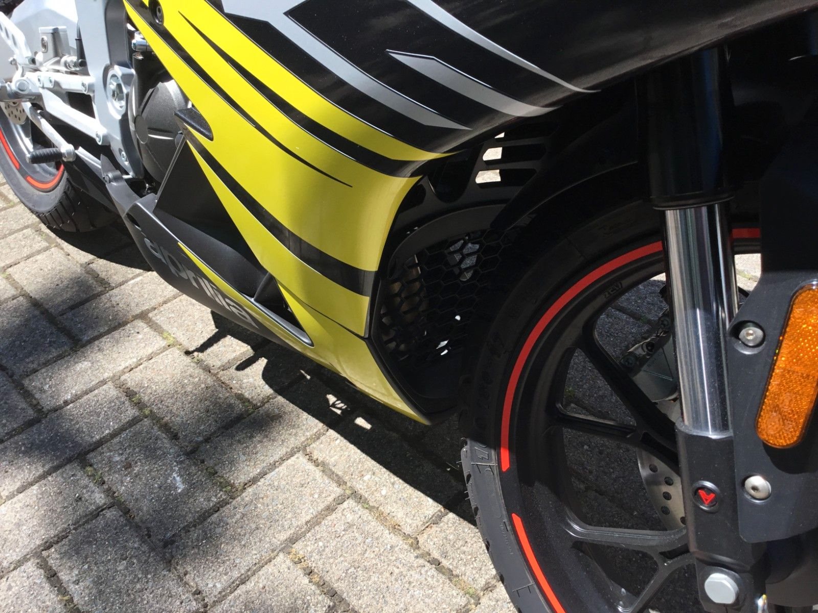- Maximale Kontrolle und starke Bremsleistung. Das Fahrwerk und das Bremssystem der Aprilia RS 125 sind "Best in Class", mit Lösungen und Performance, die von Motorrädern höherer Hubraumklassen inspiriert sind. Der Aluminiumrahmen besteht aus druckgegossenen Trägern mit verstärkenden Querverstrebungen. An der Vorderachse sorgt eine USD-Gabel in Kombination mit einem radial montierten Bremssattel auf einer 300-mm-Stahlbremsscheibe für kraftvolle und präzise Bremsmanöver. Das Zweikanal-ABS, in Zusammenarbeit mit Bosch entwickelt, ist mit einem Stoppie Control ausgestattet und sorgt für noch mehr Sicherheit bei Notbremsungen.