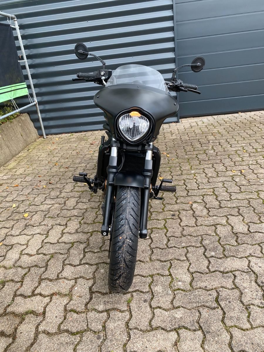 Das Fahrzeug ist ausgestattet mit der Batwing Lenkerverkleidung, Spiegel Montana, Keller Atto Blinkern hinten(Brems-,Rücklicht;Blinkfunktion), Lenkerendenblinkern Mo.Blaze, Brems.-u.Kupplungshebel Spiegler Tusker schwarz,