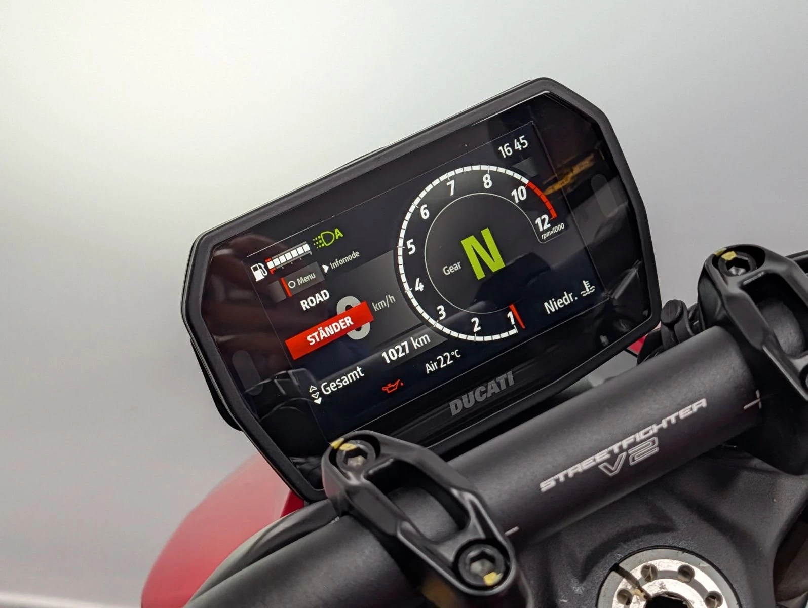 Eine fast neue Ducati Streetfighter V2 S - perfekt für Fahrer, die ein leistungsstarkes, agiles und sofort startklares Naked-Bike mit unverwechselbarem Ducati-Charakter suchen.