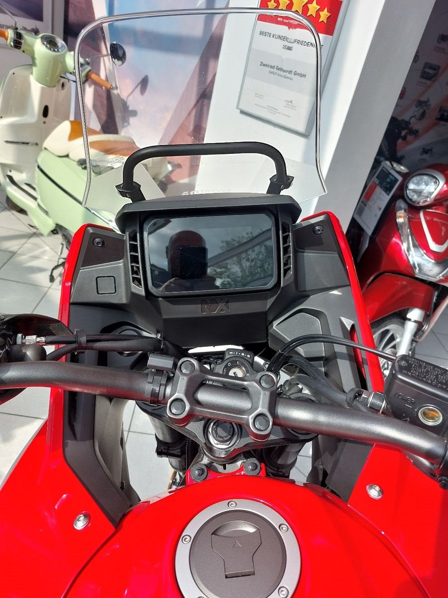 Honda NX500 Gebrauchtfahrzeug, 5 Zoll TFT Farbdisplay mit Konnektivität, HSTC Traktionskontrolle, Notbremssignal, Upside Down Gabel, LED Beleuchtung, USB-Steckdose am Lenker, Handprotektoren, Euro 5+, CO2 kombiniert 82g/km, Kraftstoffverbrauch nach WMTC 3,6 l/100Km, Gewicht vollgetank 196kg.