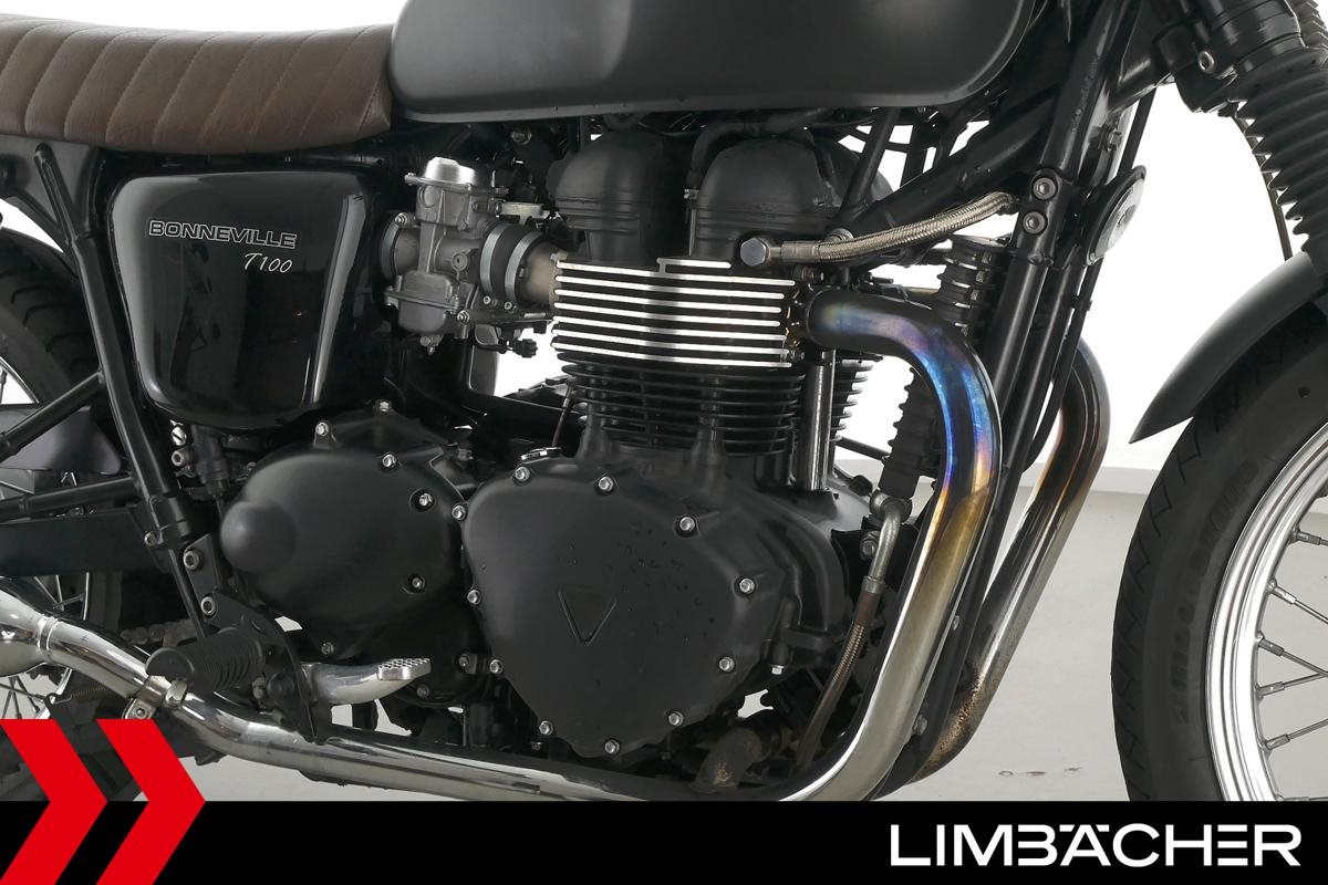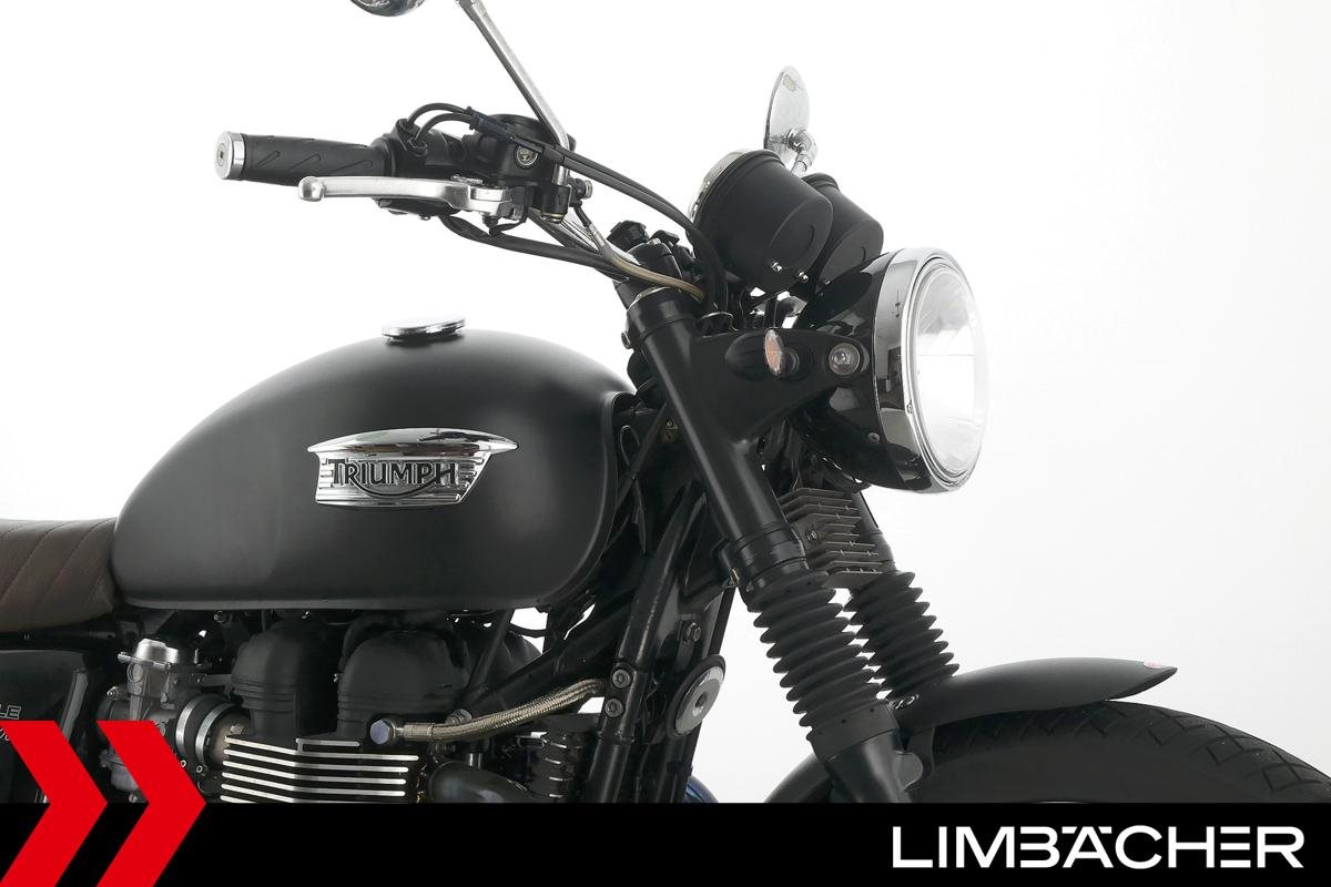 Eine Triumph Bonneville T100 in gepflegtem Zustand u.a. mit kurzem Kennzeichenhalter und Sonderlenker.
