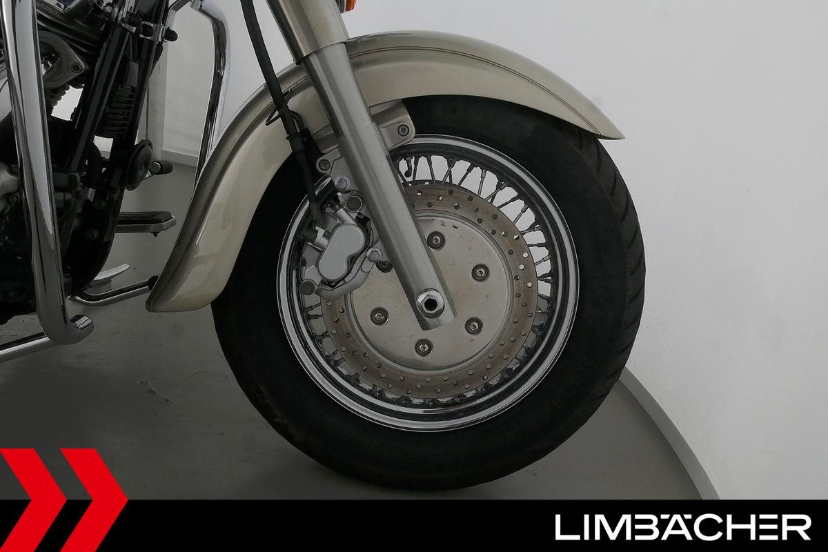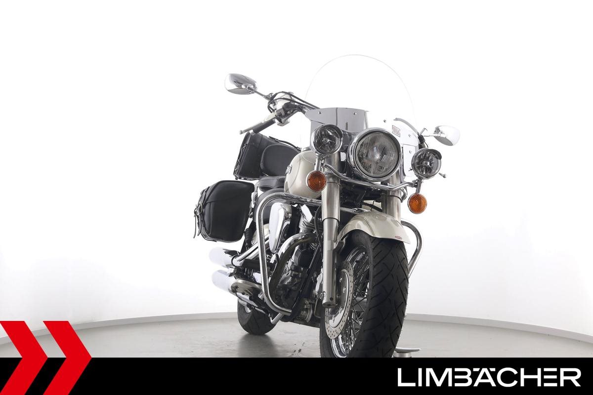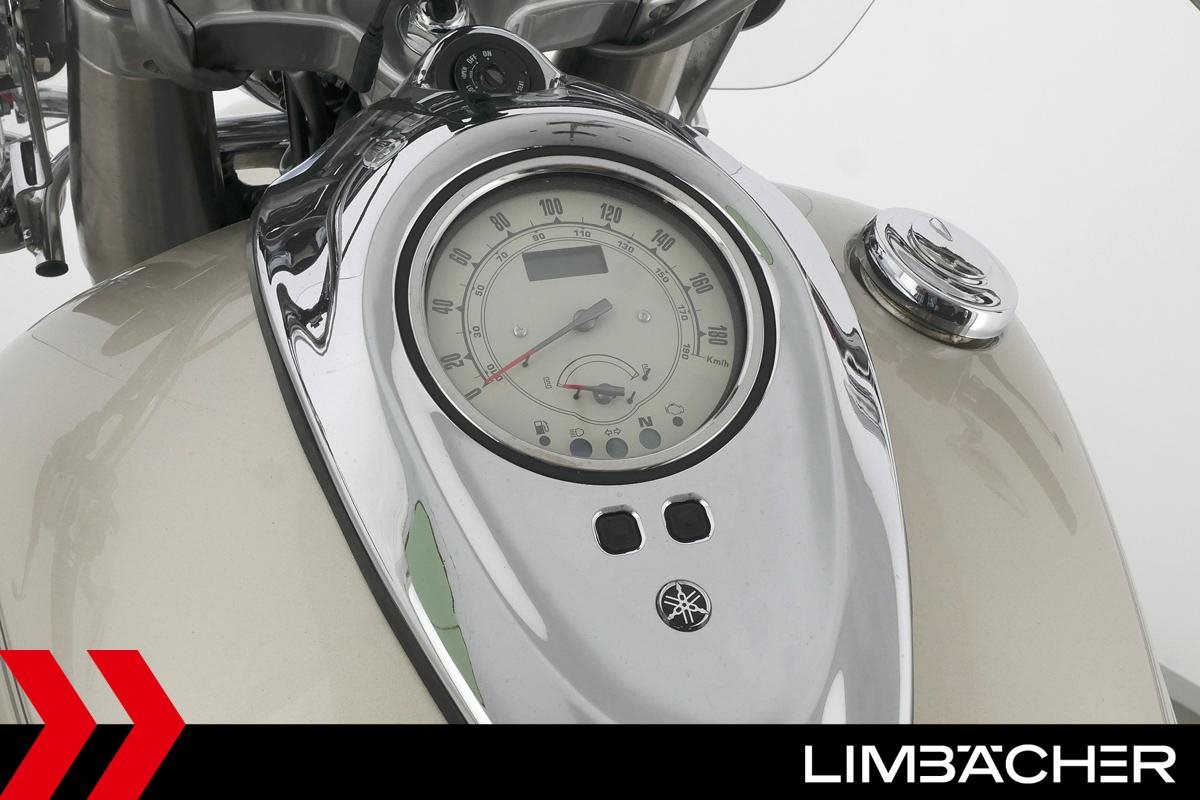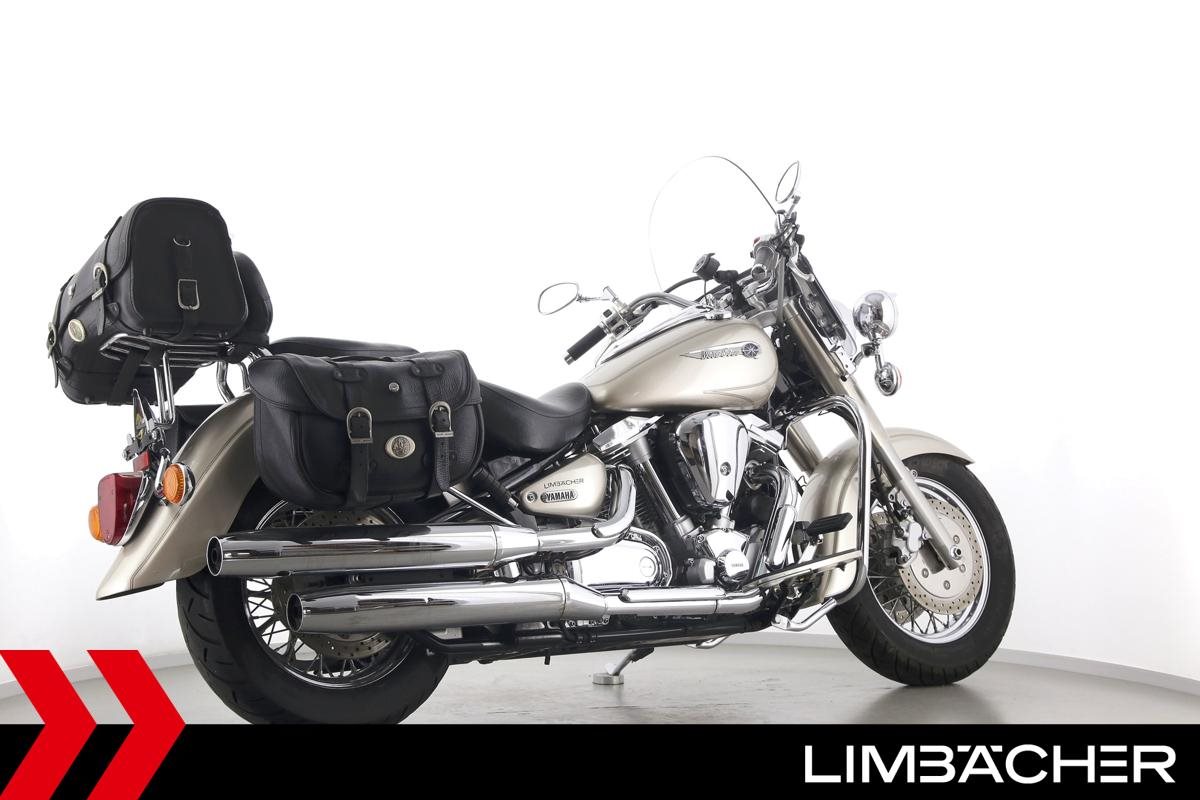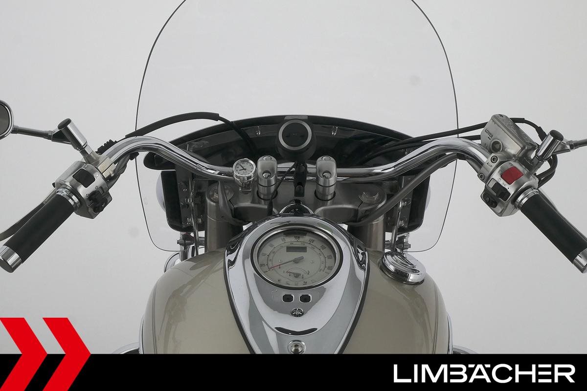 Eine Yamaha XV 1600 Wild Star in gepflegtem Zustand u.a. mit Sturzbügel sowie großem Touring-Windschild.