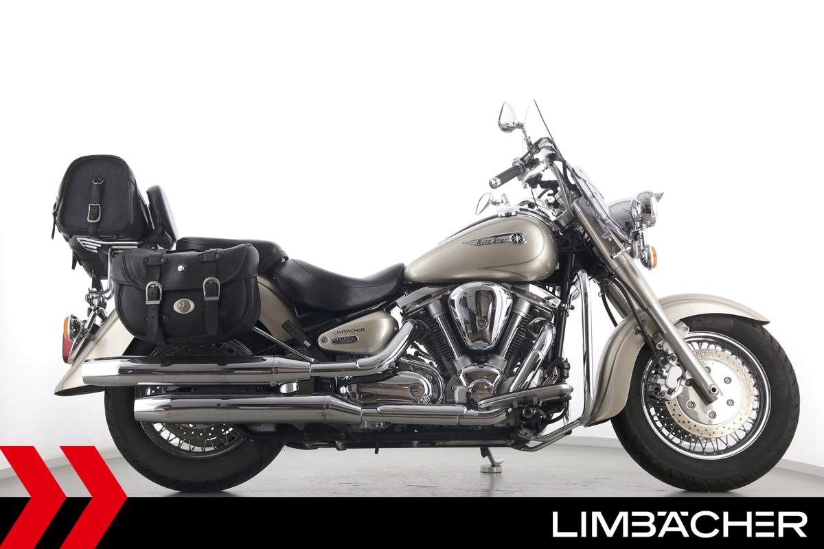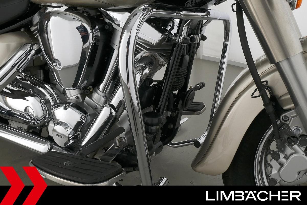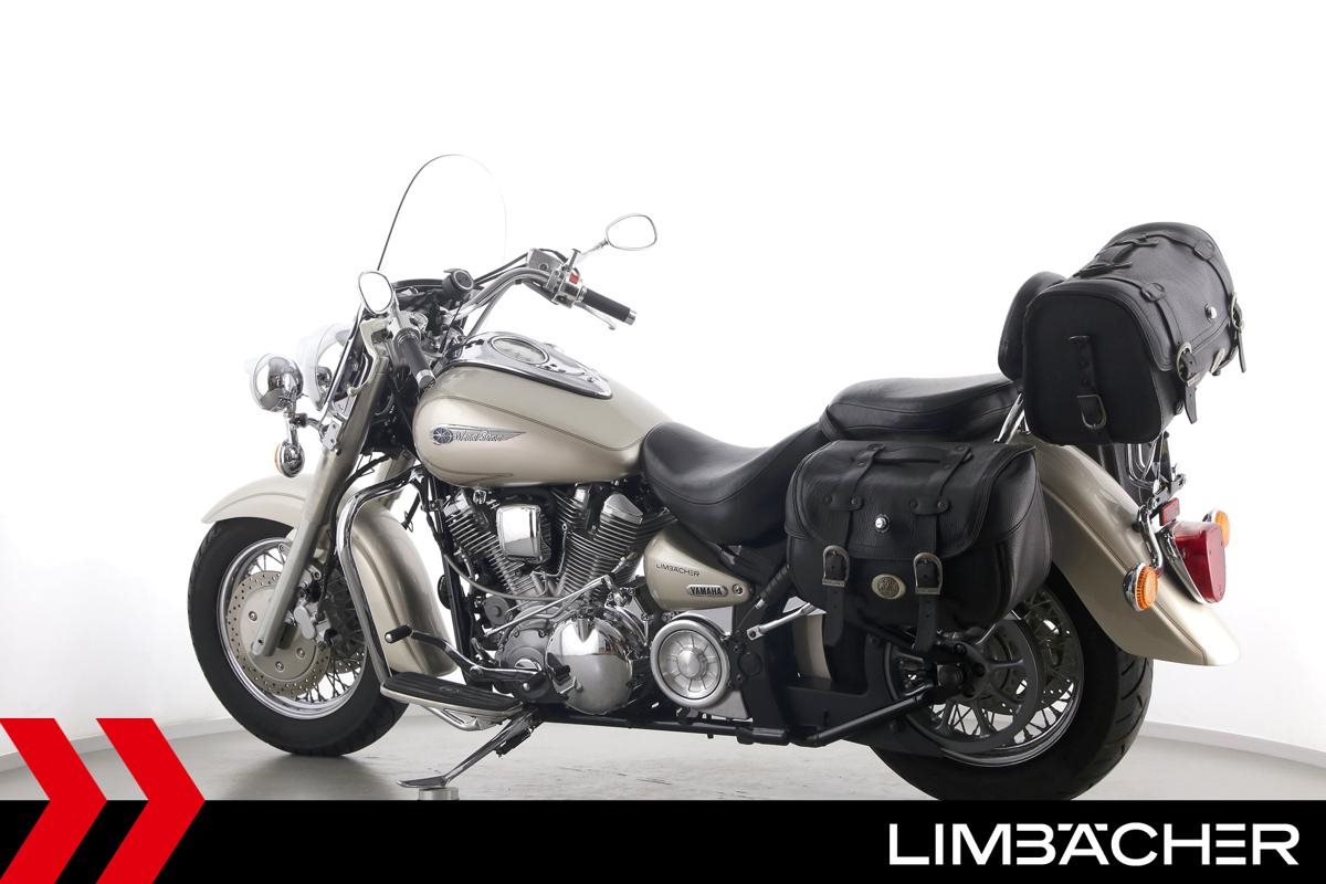Eine Yamaha XV 1600 Wild Star in gepflegtem Zustand u.a. mit Sturzbügel sowie großem Touring-Windschild.