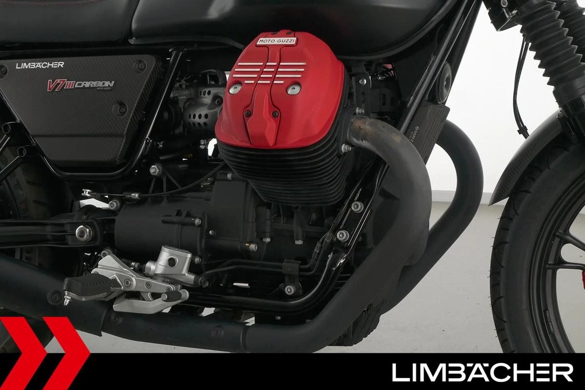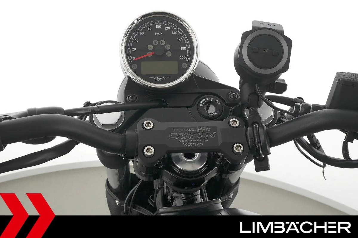 Eine Moto Guzzi V7 III Carbon aus zweiter Hand in gepflegtem Zustand als Sondermodell 1020/1921 u.a. mit gesteppter Komfortsitzbank.
