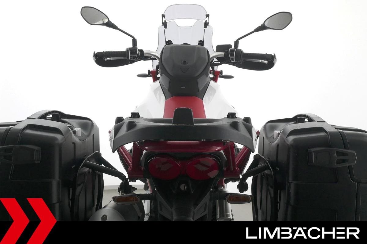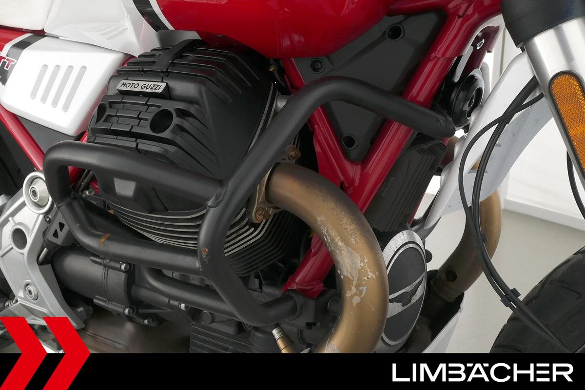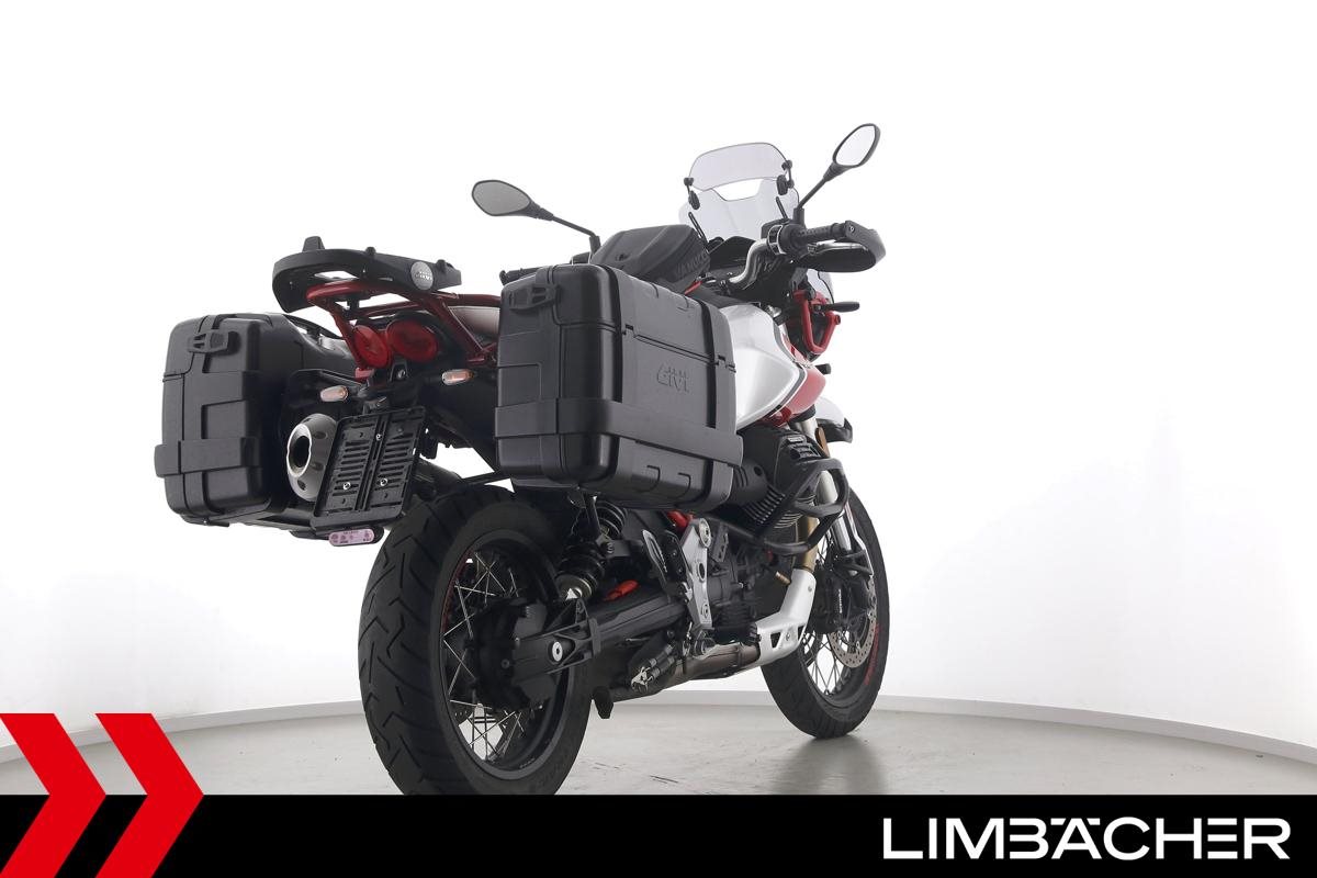 Eine Moto Guzzi V85 TT aus zweiter Hand in gepflegtem Zustand u.a. mit Givi-Koffersystem sowie Sturzbügeln in schwarz.