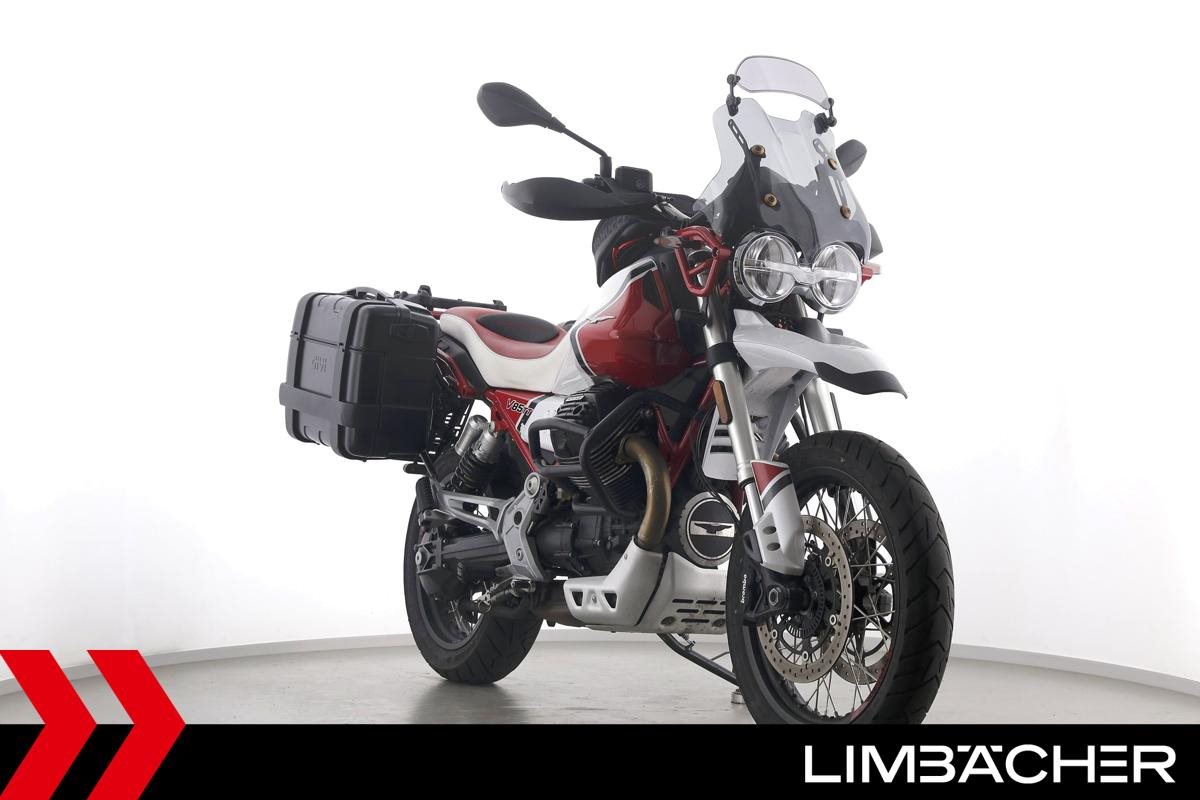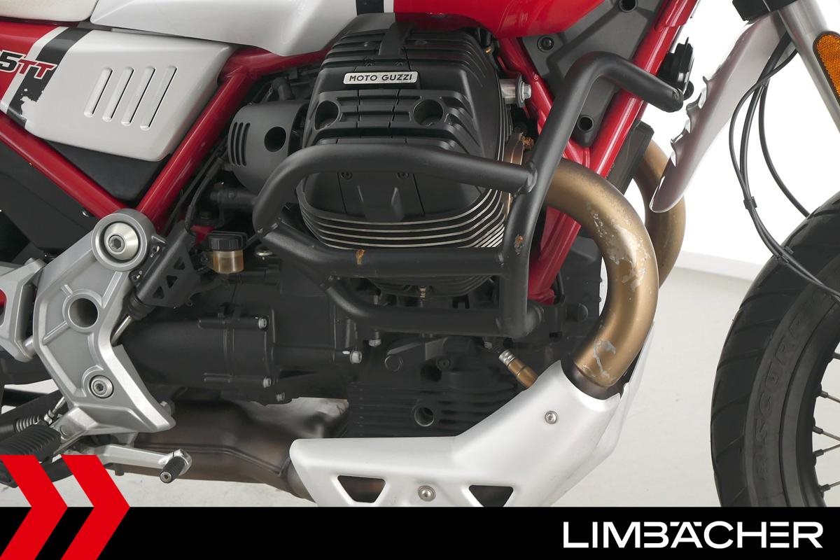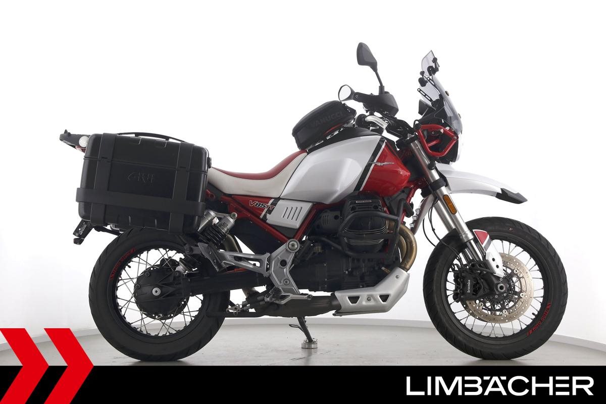 Eine Moto Guzzi V85 TT aus zweiter Hand in gepflegtem Zustand u.a. mit Givi-Koffersystem sowie Sturzbügeln in schwarz.