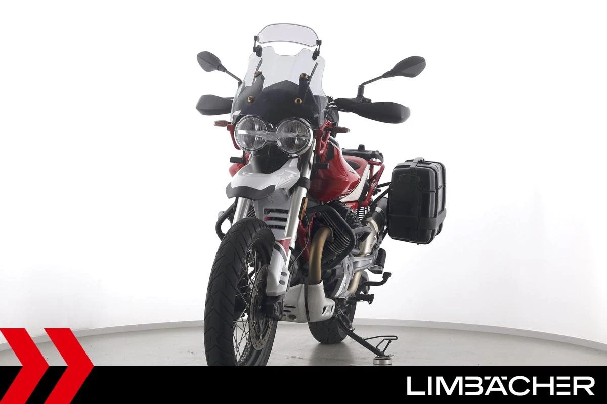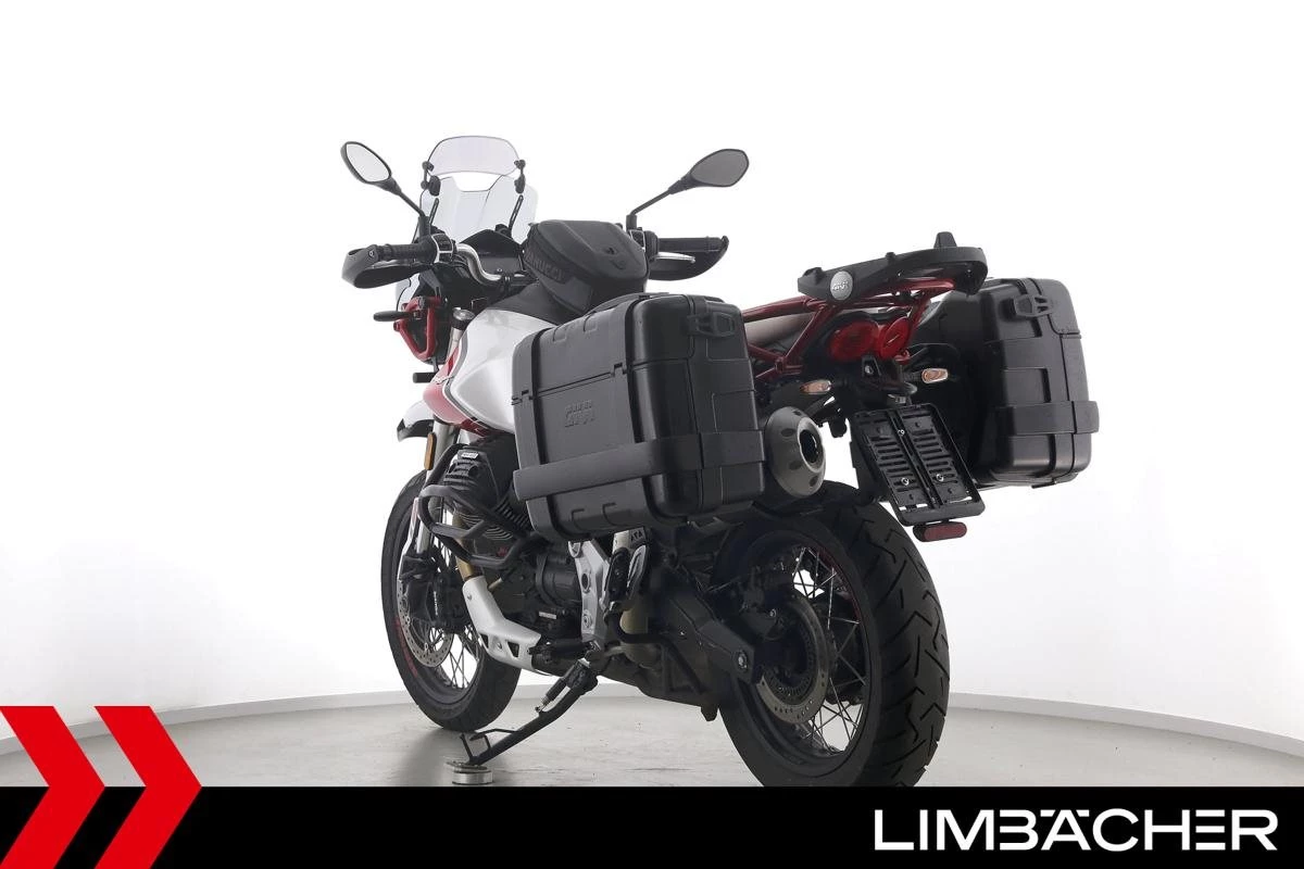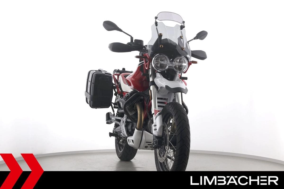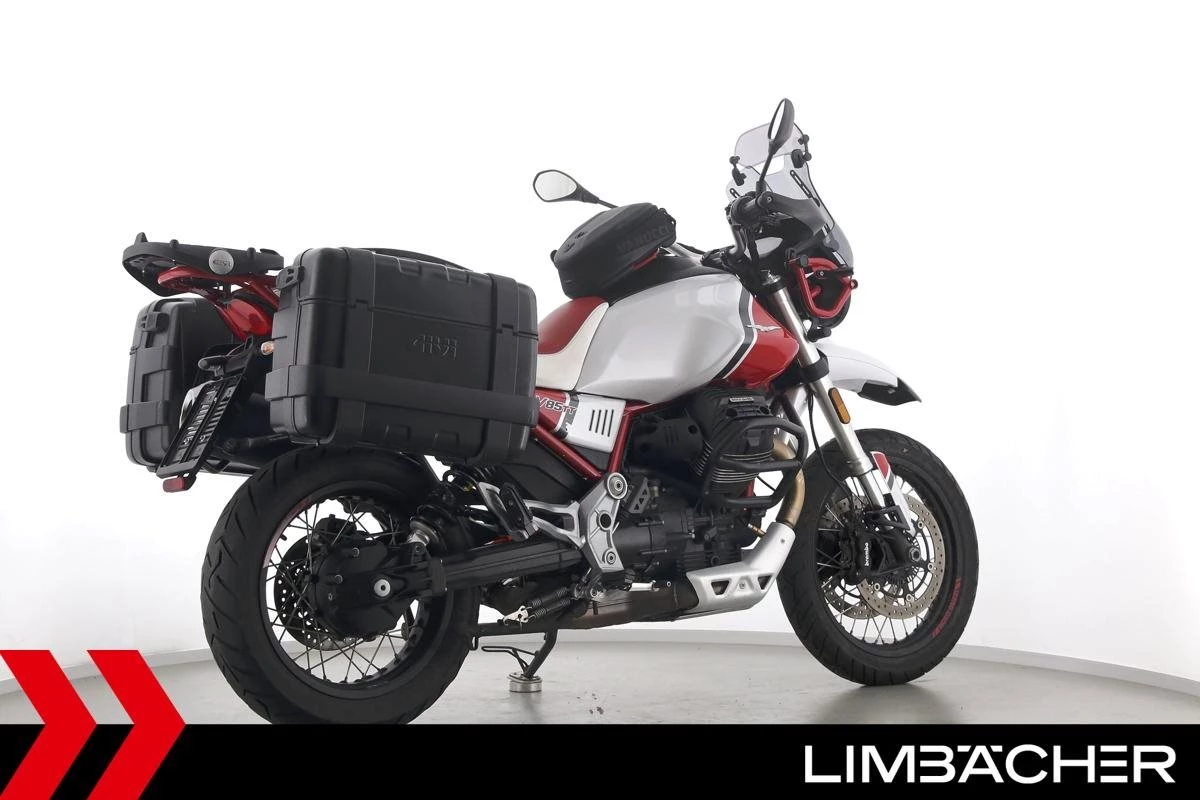 Eine Moto Guzzi V85 TT aus zweiter Hand in gepflegtem Zustand u.a. mit Givi-Koffersystem sowie Sturzbügeln in schwarz.