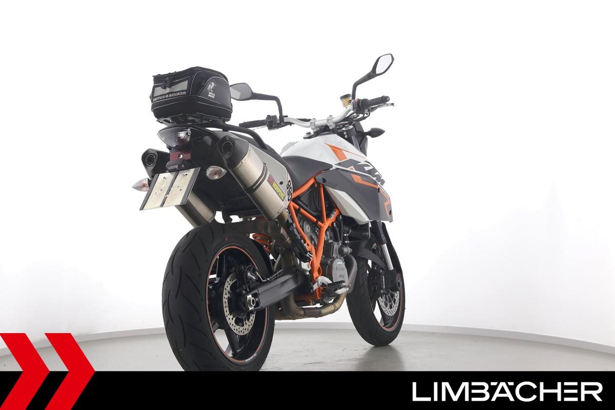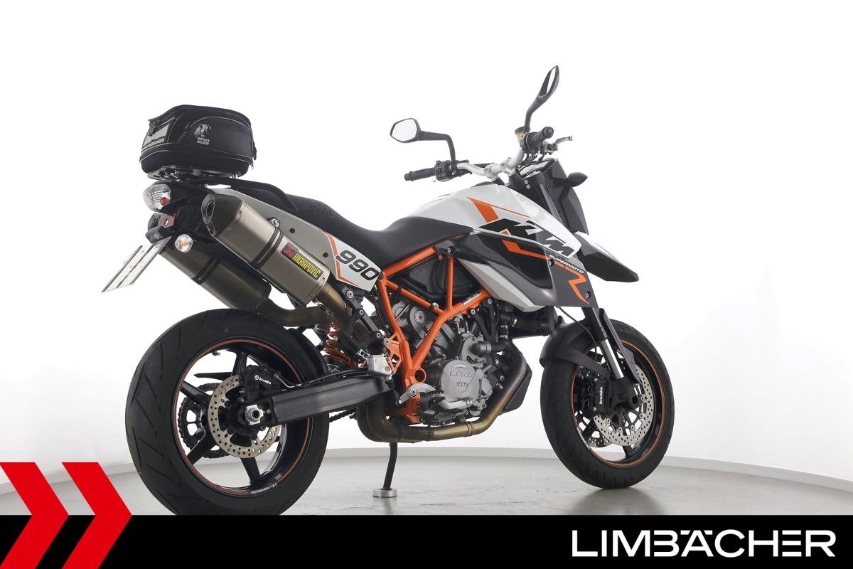 Eine KTM 990 Supermoto aus zweiter Hand in sehr gepflegtem Zustand u.a. mit Akrapovic-Endschalldämpfer sowie Hepco&Becker Gepäcktasche.
