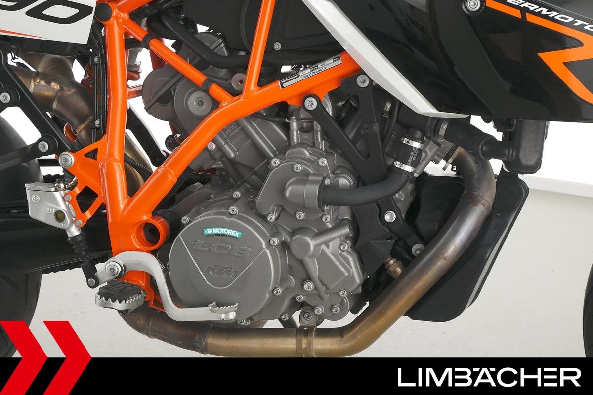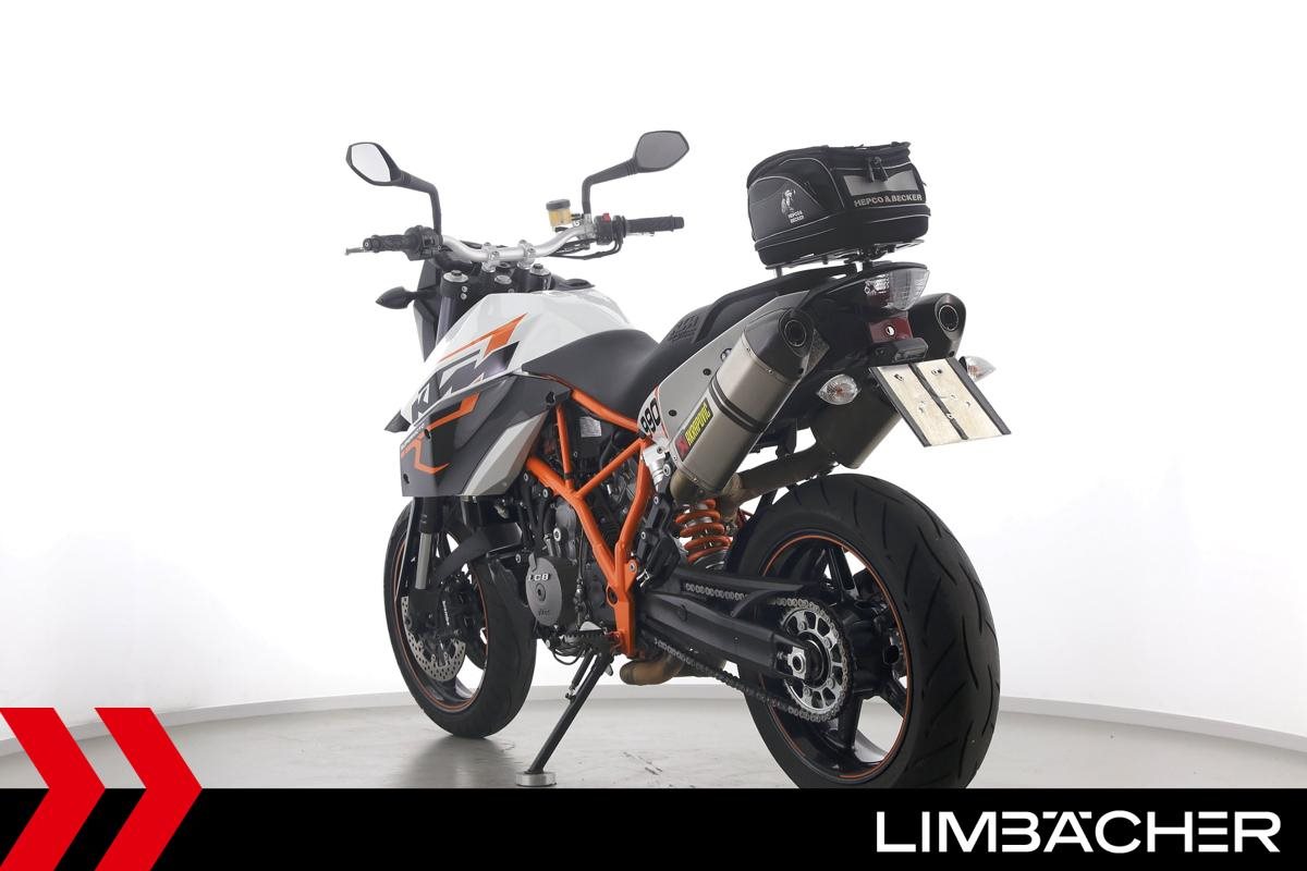 Eine KTM 990 Supermoto aus zweiter Hand in sehr gepflegtem Zustand u.a. mit Akrapovic-Endschalldämpfer sowie Hepco&Becker Gepäcktasche.