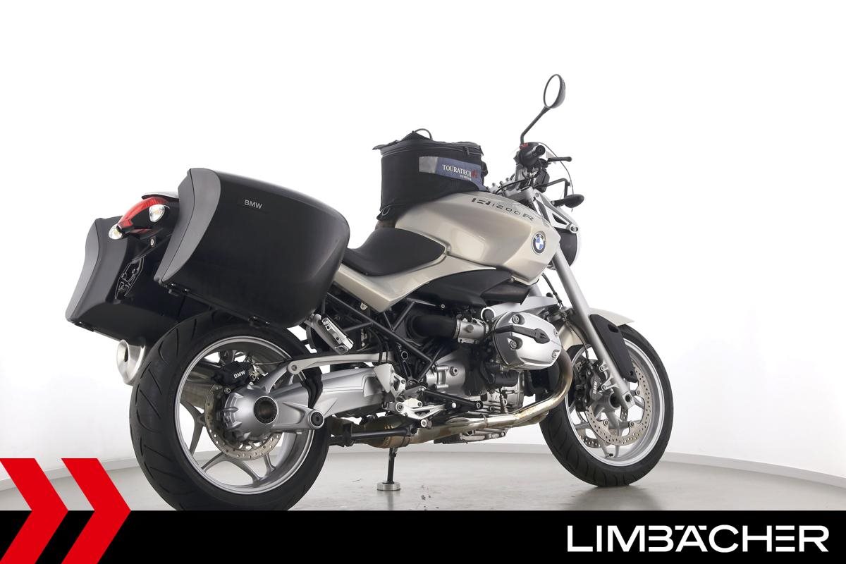 Eine BMW R 1200 R in gepflegtem Zustand u.a. mit BMW-Koffersystem und Touratech-Tankrucksack.