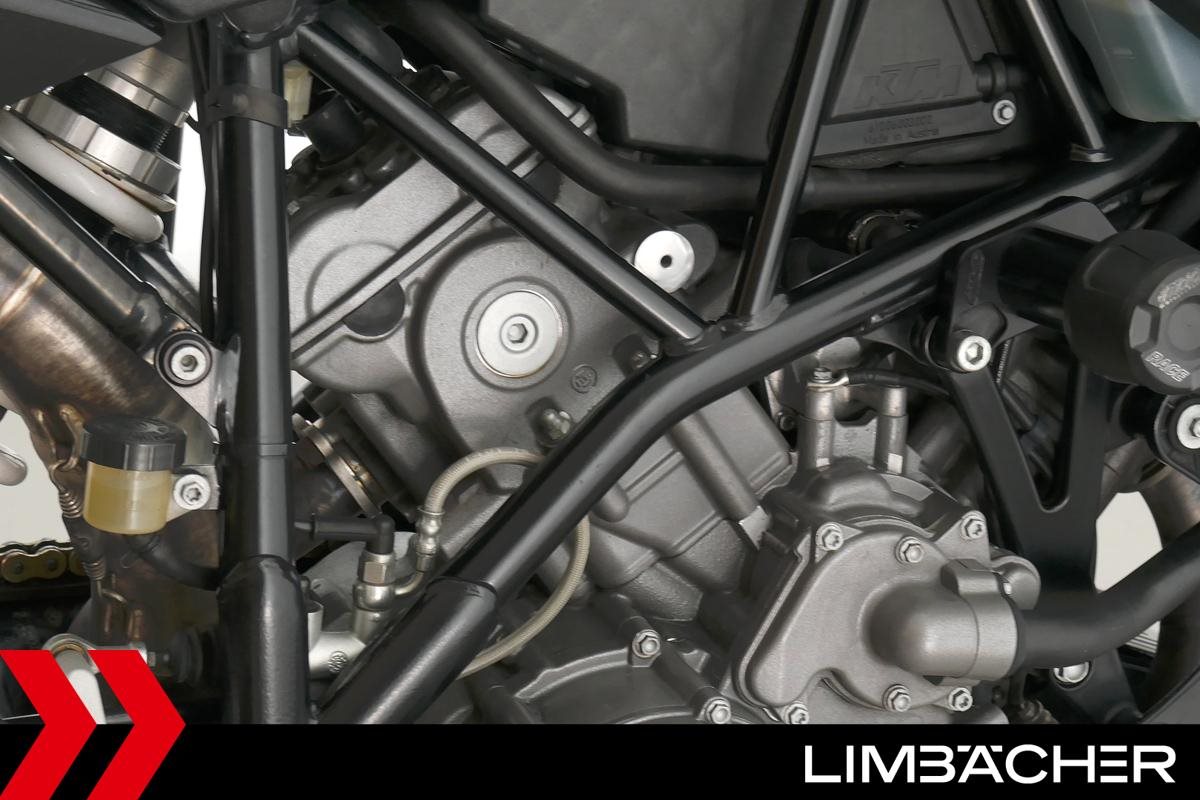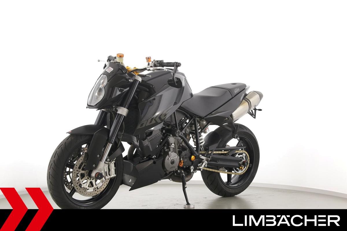 Eine scheckheftgepflegte KTM 990 Super Duke aus zweiter Hand in gebrauchtem Zustand u.a. mit Akrapovic-Endschalldämpfer und Magura-Lenker.