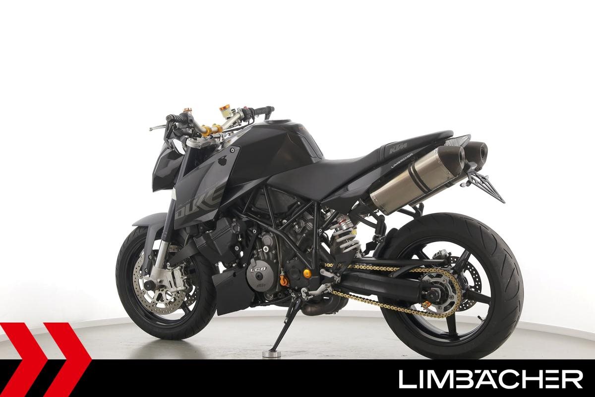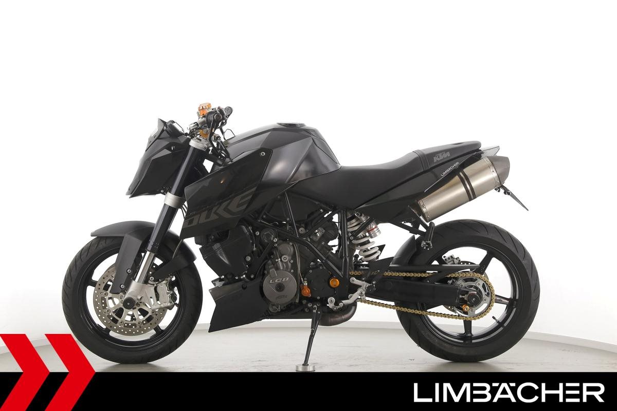 Eine scheckheftgepflegte KTM 990 Super Duke aus zweiter Hand in gebrauchtem Zustand u.a. mit Akrapovic-Endschalldämpfer und Magura-Lenker.