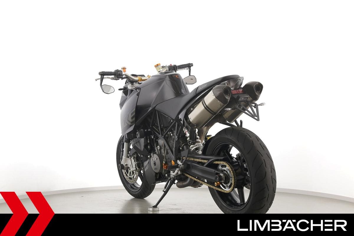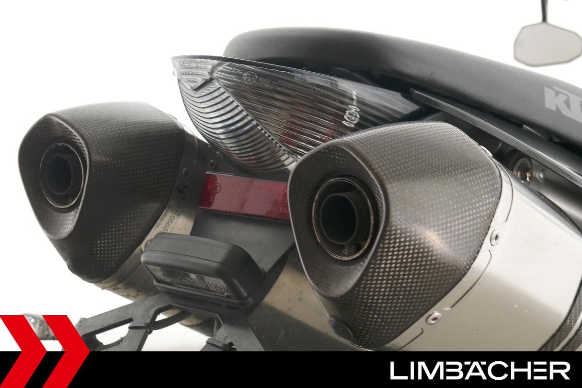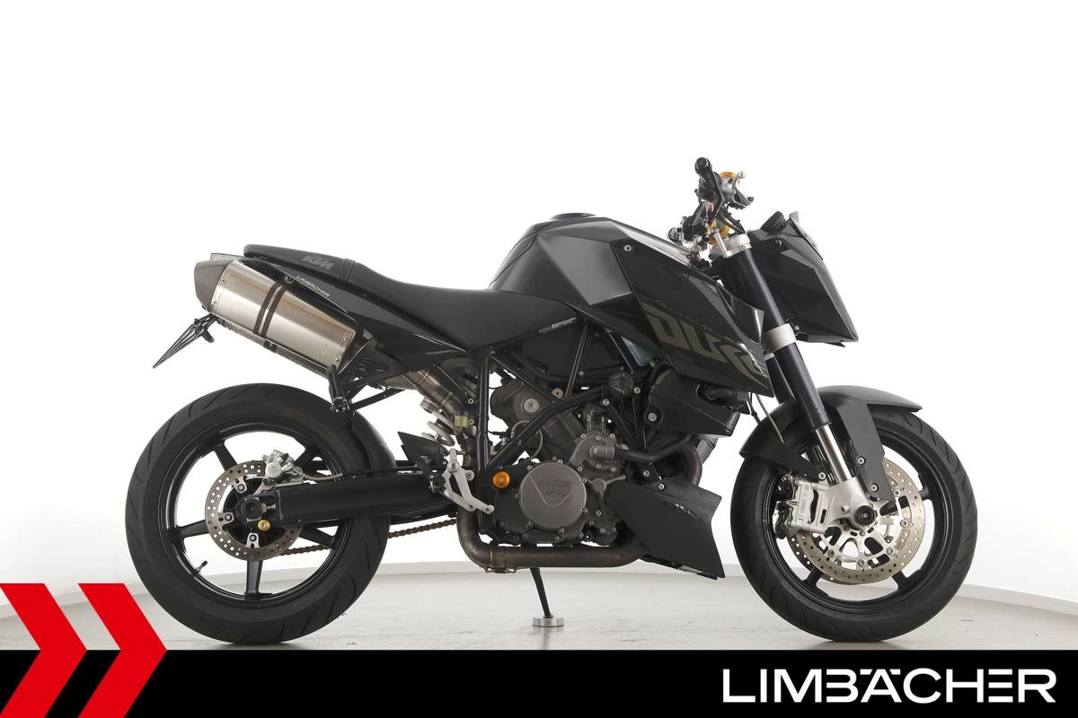 Eine scheckheftgepflegte KTM 990 Super Duke aus zweiter Hand in gebrauchtem Zustand u.a. mit Akrapovic-Endschalldämpfer und Magura-Lenker.