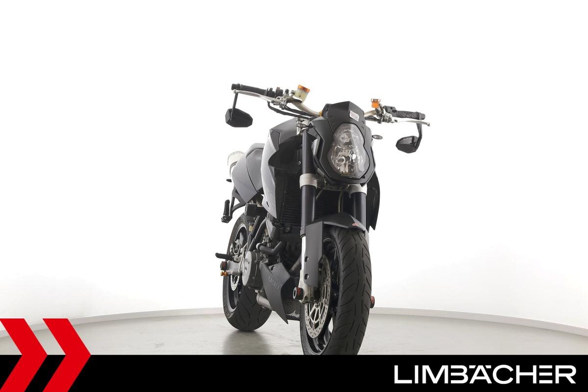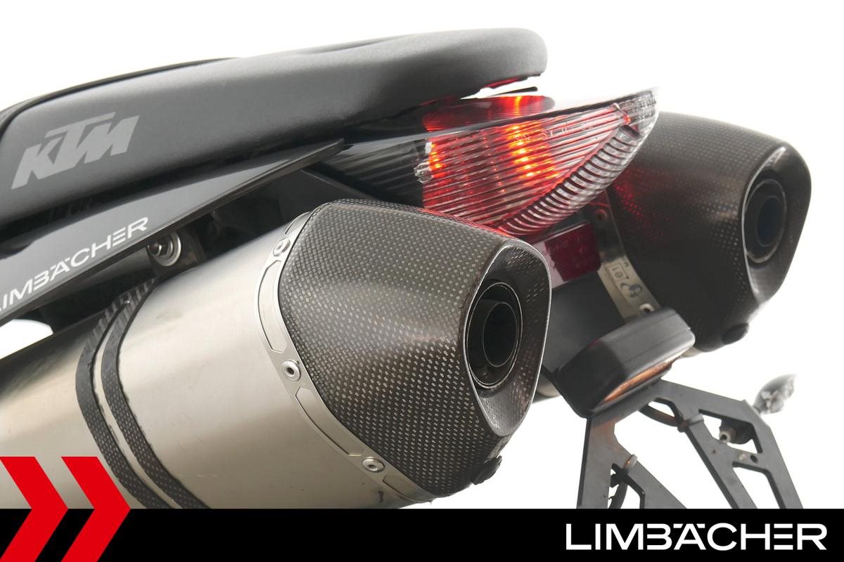 Eine scheckheftgepflegte KTM 990 Super Duke aus zweiter Hand in gebrauchtem Zustand u.a. mit Akrapovic-Endschalldämpfer und Magura-Lenker.