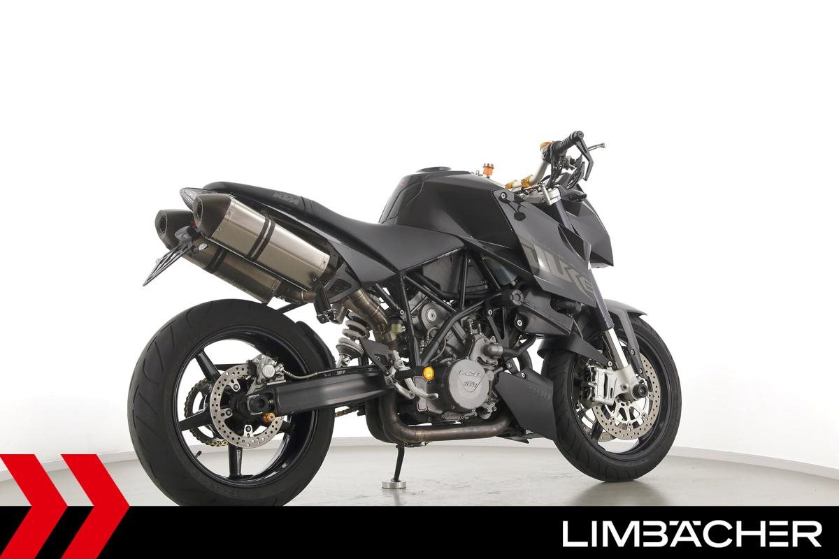 Eine scheckheftgepflegte KTM 990 Super Duke aus zweiter Hand in gebrauchtem Zustand u.a. mit Akrapovic-Endschalldämpfer und Magura-Lenker.