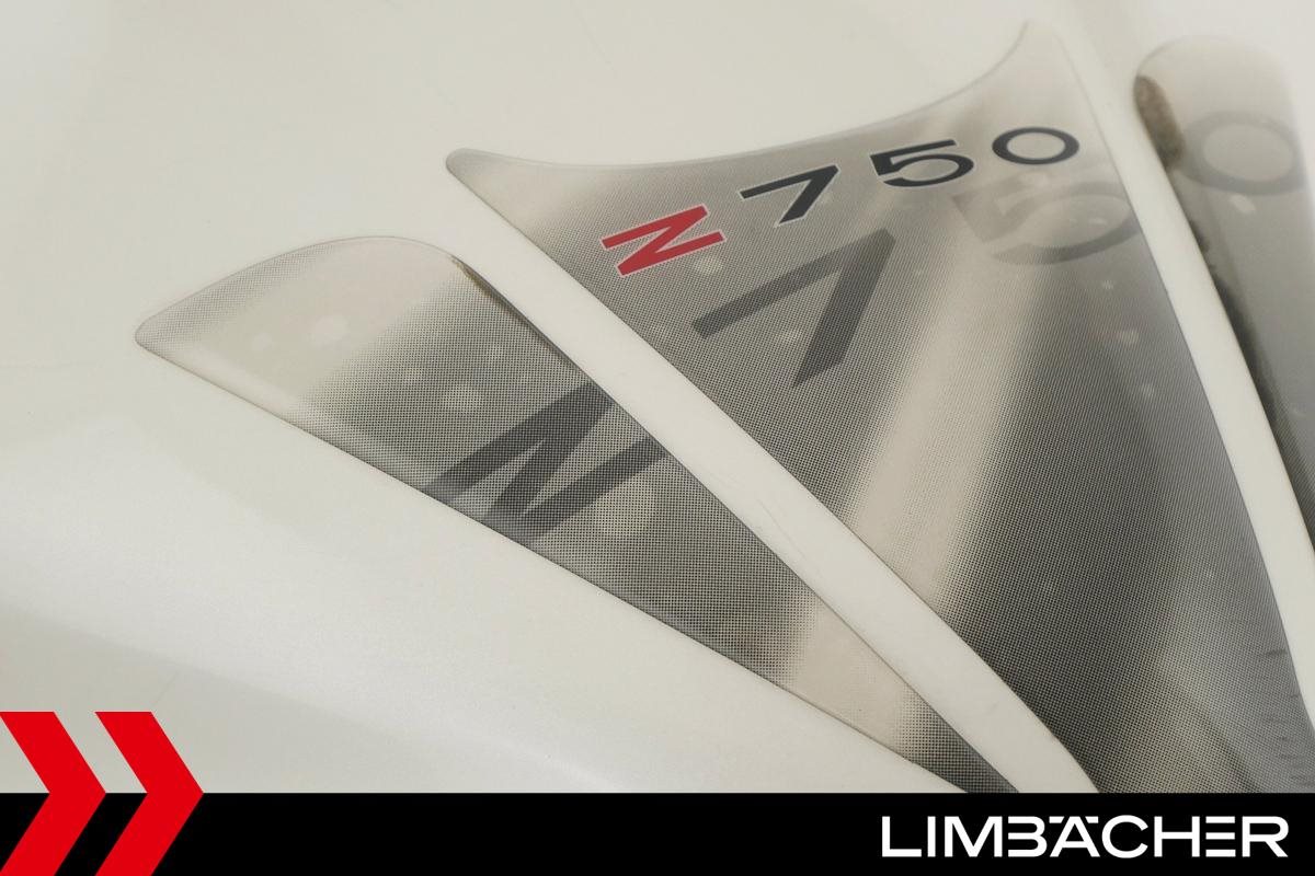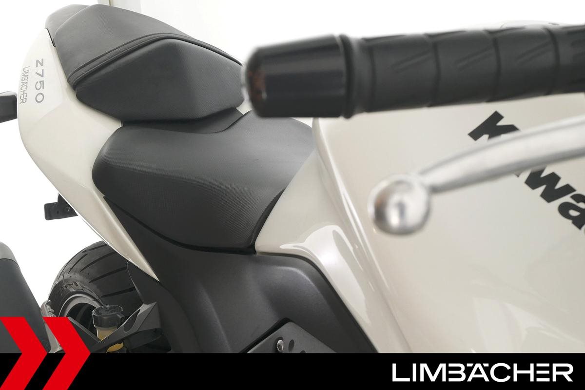 Eine Kawasaki Z 750 in gebrauchtem Zustand mit Montageheber-Aufnahmen und Tankpad.