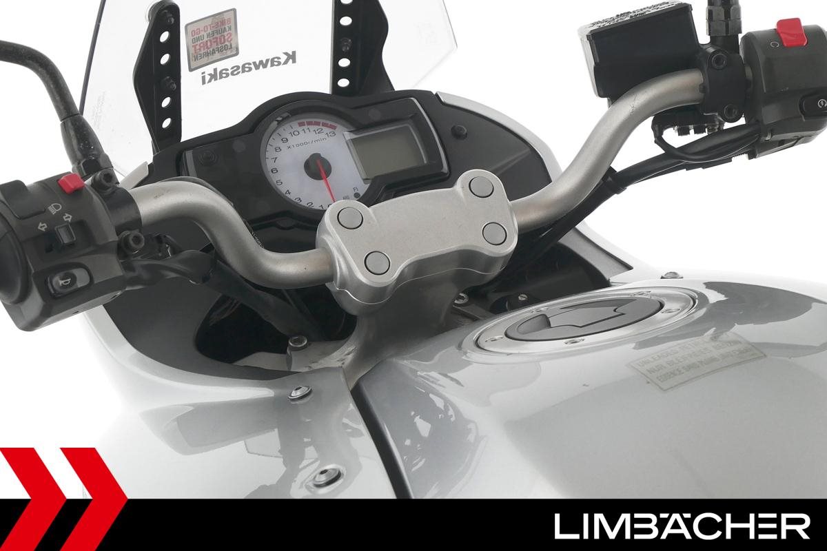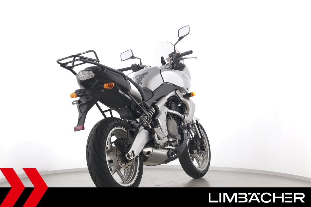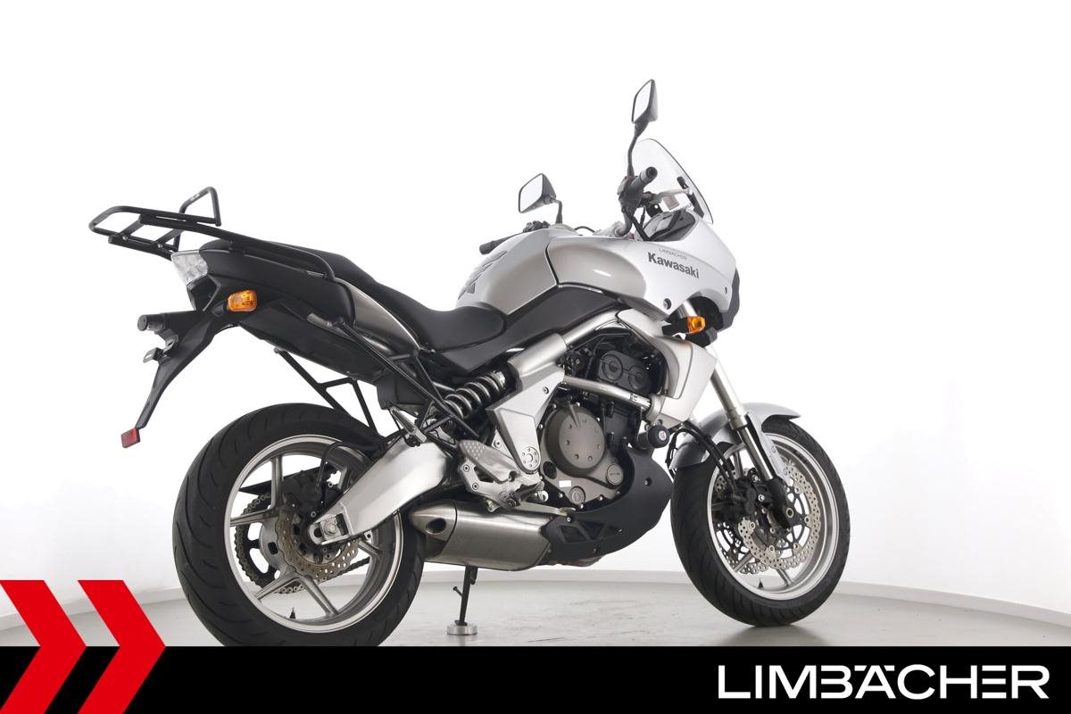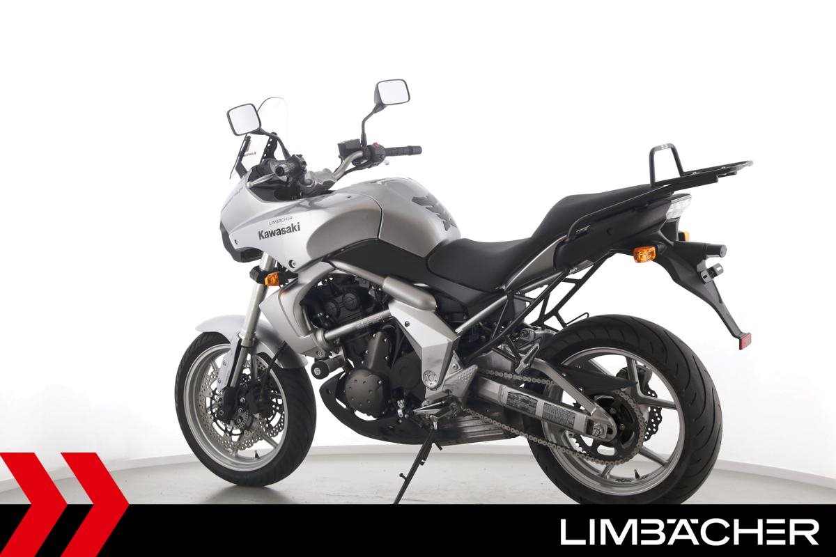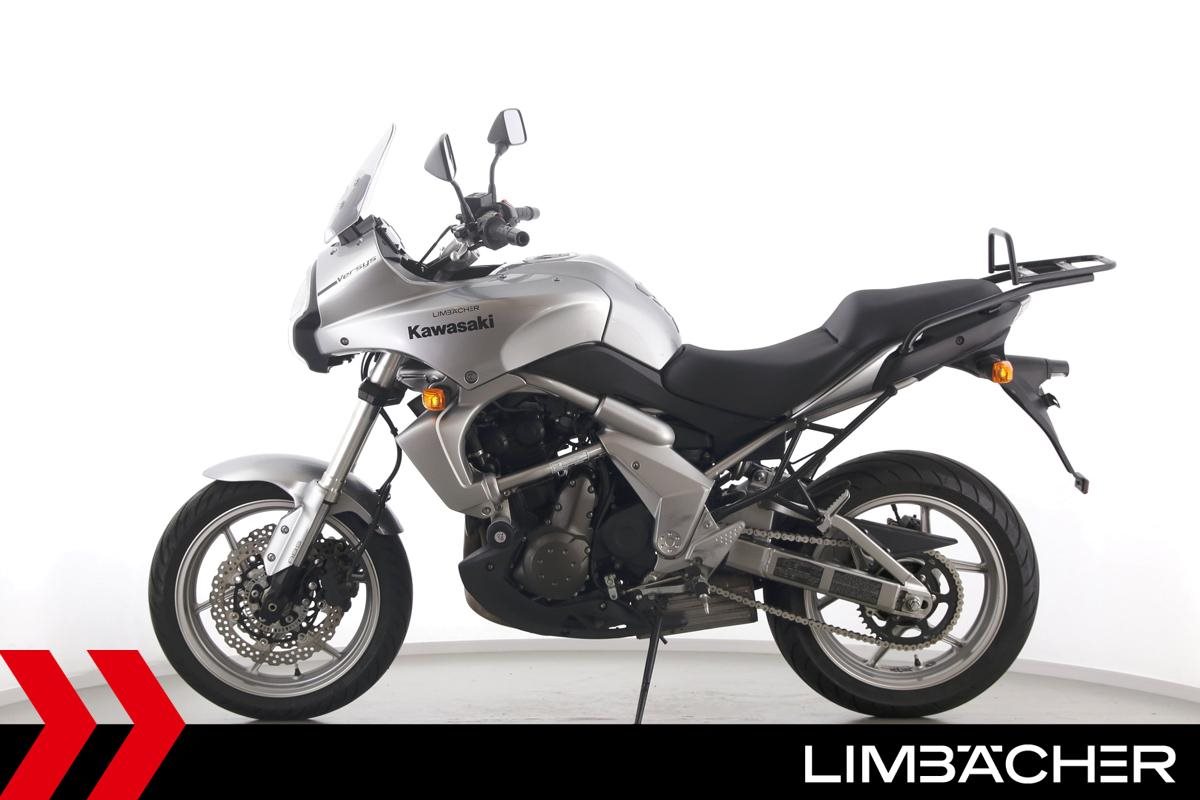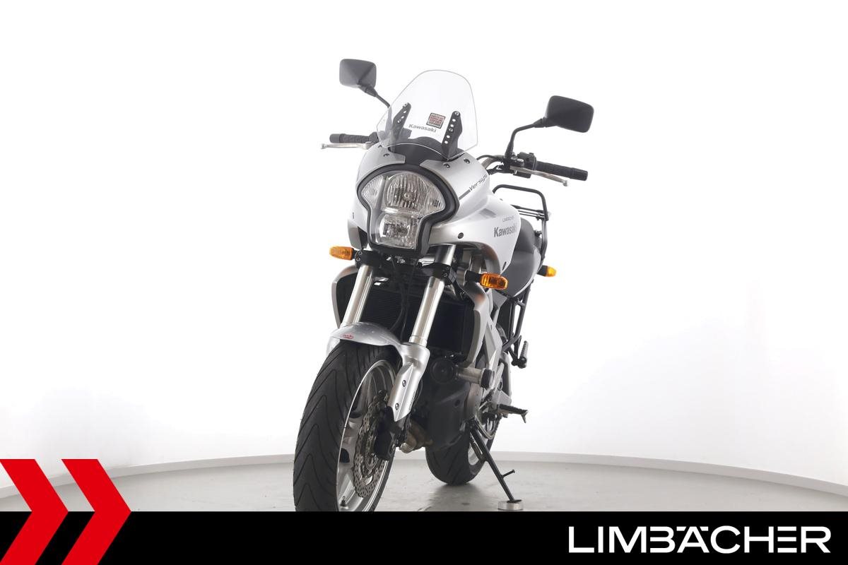 Eine Kawasaki Versys 650 in gepflegtem Zustand u.a. mit Drosselung auf 35 kW und Hepco & Becker-Gepäckträger.