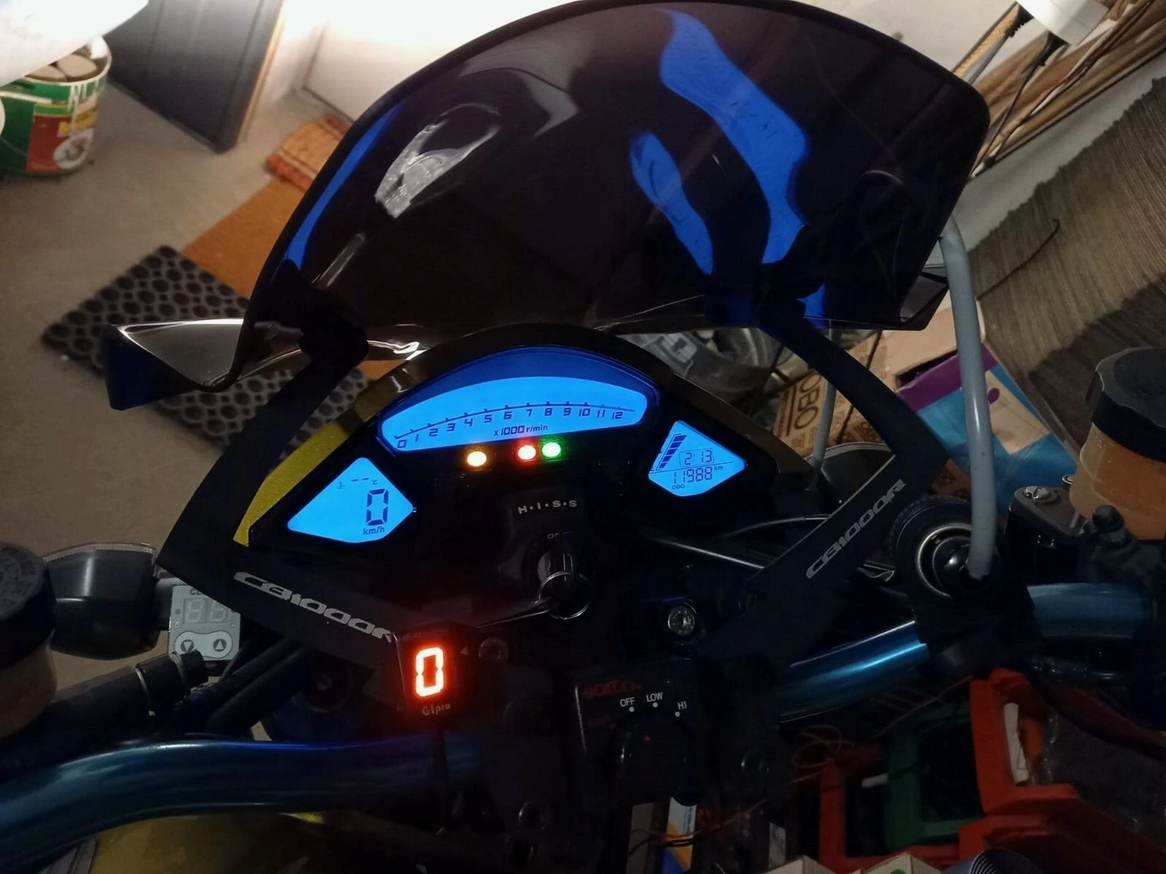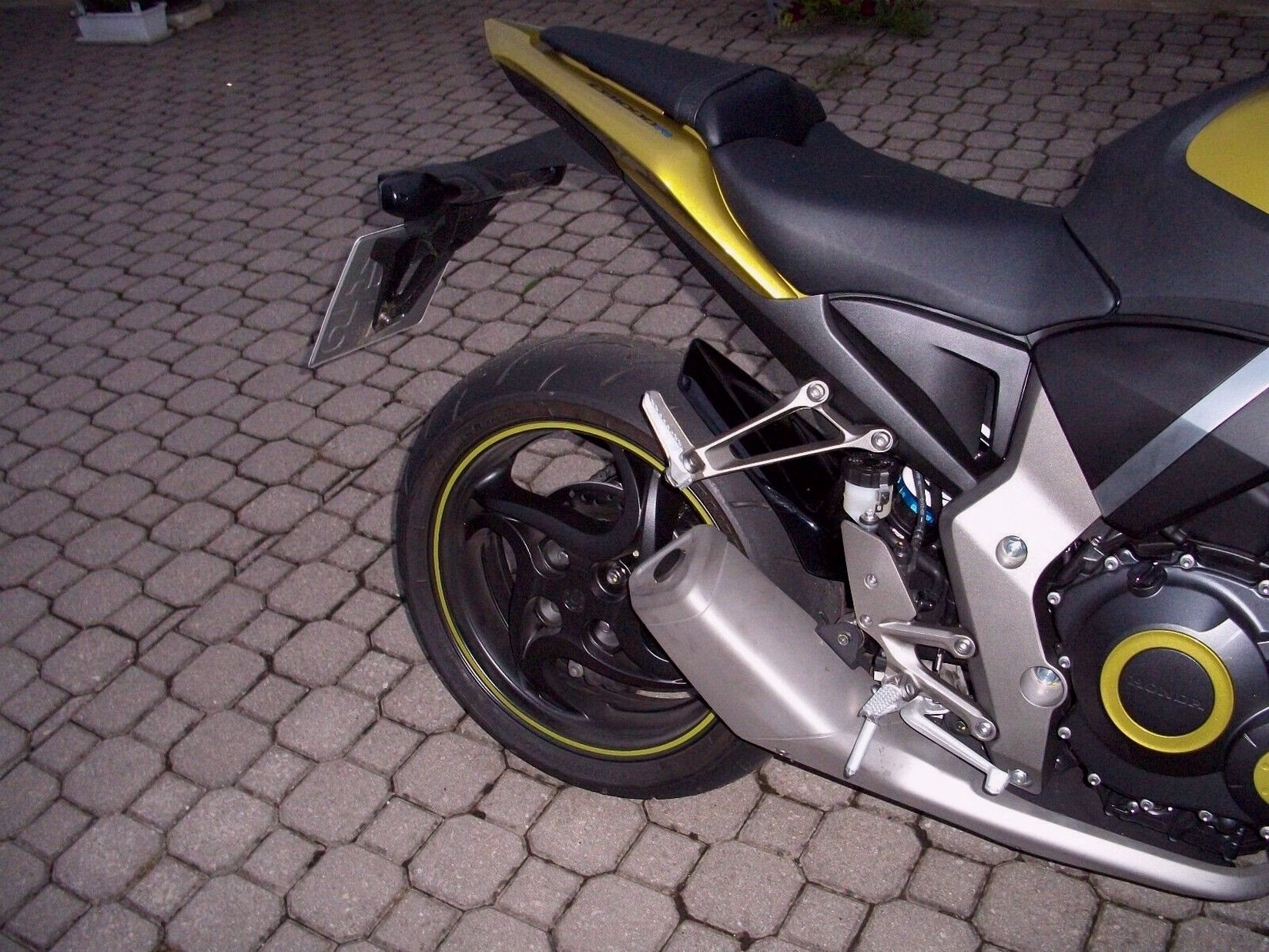 Motorspoiler und Hinterrad (Innenkotflügel) Abdeckung mit Kettenschutz montiert. Ketten Öler (automatisch) montiert. Gang-Anzeige montiert und füntionsfähig. Anschlusskabel für Navi-Halterung TomTom 1.Generation noch verbaut.