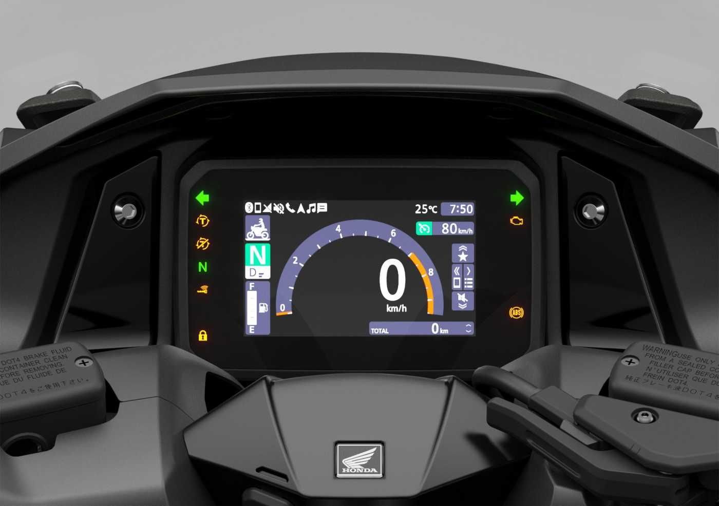 - Gut sichtbar auch bei hellem Sonnenlicht, mit neuem beleuchteten 4-Wege-Lenkerschalter für eine intuitive Bedienung und ausgestattet mit Smartphone-Konnektivität per Honda RoadSync für Bildschirmnavigation und vieles mehr.