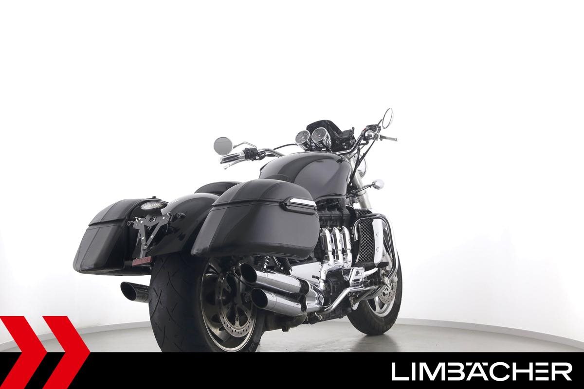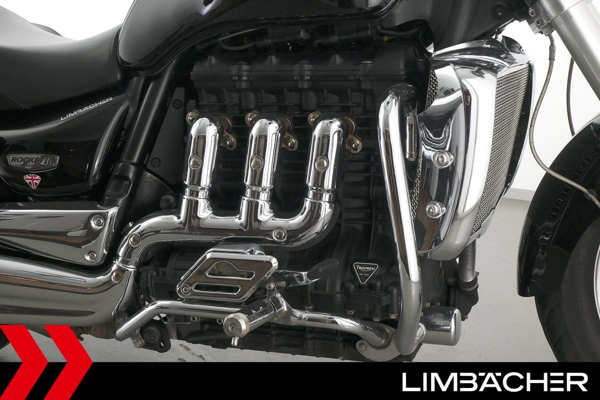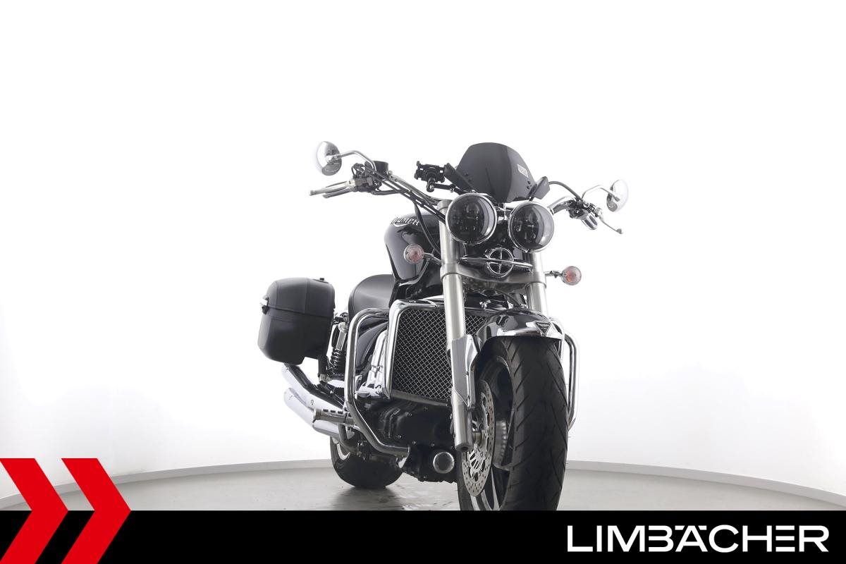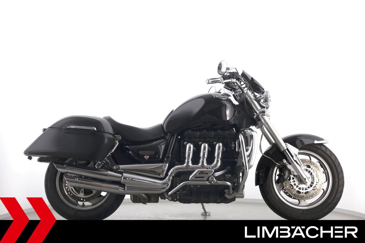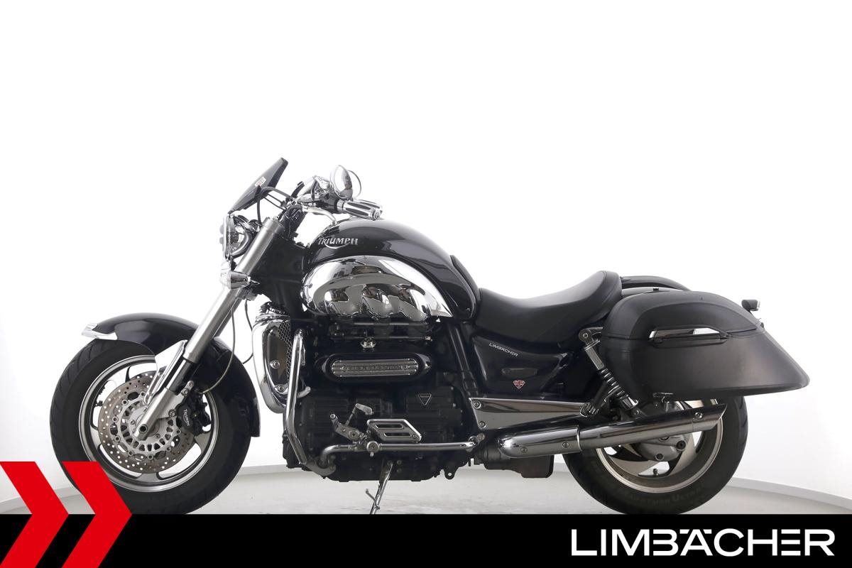 Eine Triumph Rocket III in gepflegtem Zustand u.a. mit Sport-Auspuff sowie Hepco & Becker-Lederkoffer.