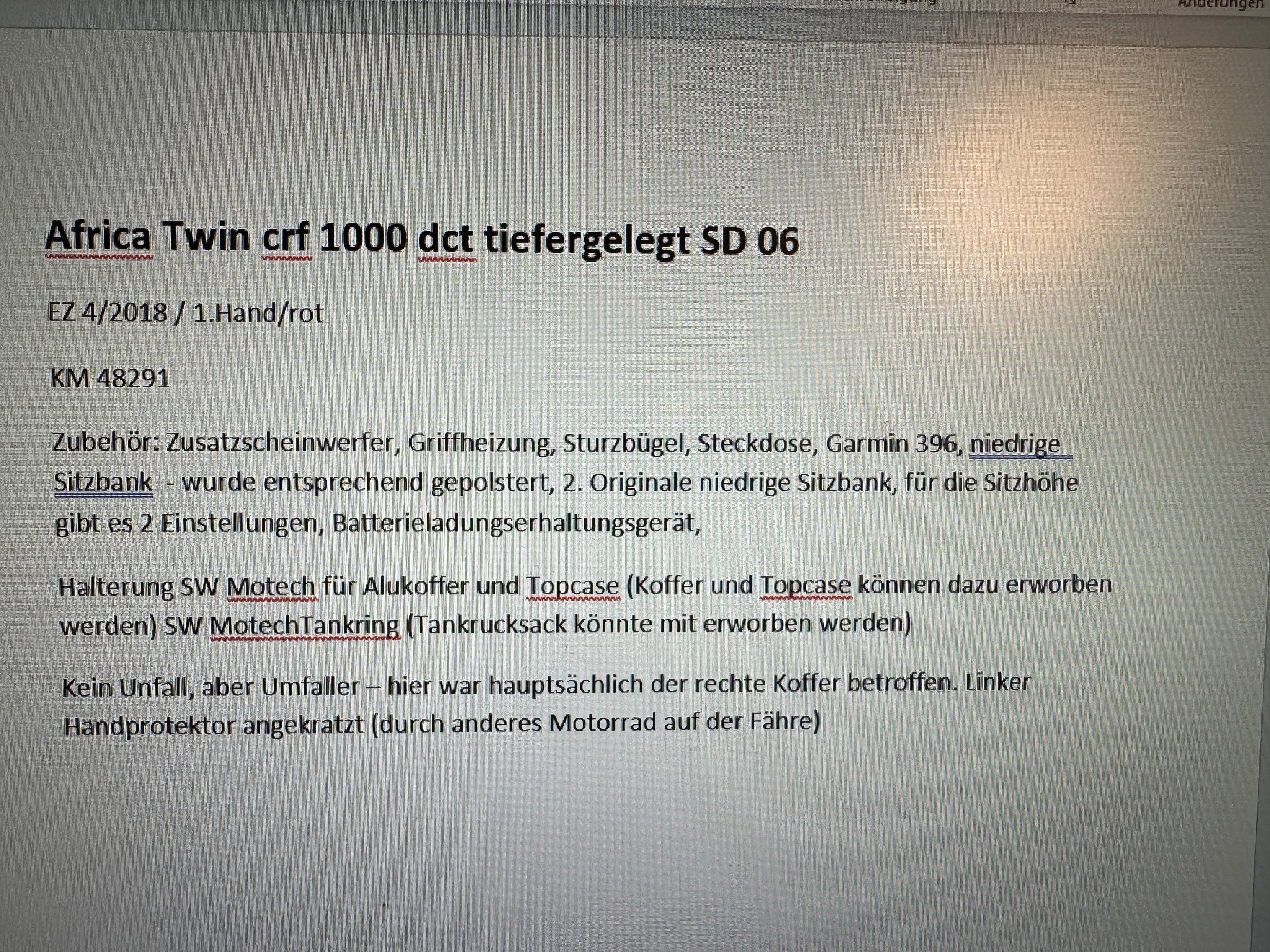 Aus Altersgründen verkaufe ich meine geliebte AT. Sie hat noch TüV bis Mai 2026. ich hatte keinen Unfall, aber sie ist mir 2x umgefallen. Da ich immer mit Koffern gefahren bin, hat die AT so gut wie nichts abbekommen. Die Maschine ist tiefergelegt. Außerdem gibt es 2 niedrige Sitzbänke dazu, 1 Original und einer etwas angepasst auf meine Bedürfnisse. Griffheizung, Sturzbügel, Zusatzscheinwerfer, Garmin 396 sind dabei. Koffer,Topcase und Tankrucksack können alternativ dazu erworben werden.