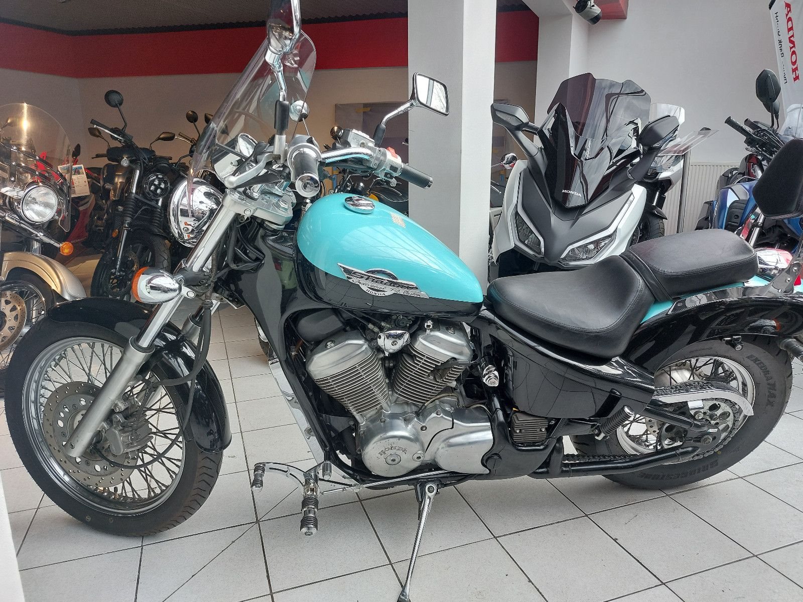 Honda VT600C Shadow, Gebrauchtfahrzeug, Windschild, vorverlegte Fussrastenanlage, Sissybar, verchromter Kühlergrill, Hupencover.