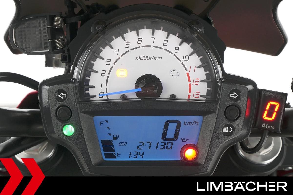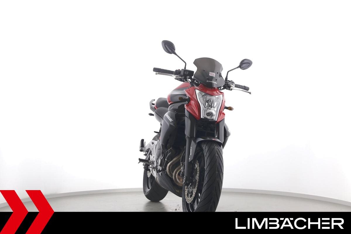 Eine scheckheftgepflegte Kawasaki ER-6n in gepflegtem Zustand u.a. mit kurzem Kennzeichenhalter sowie Ganganzeige.