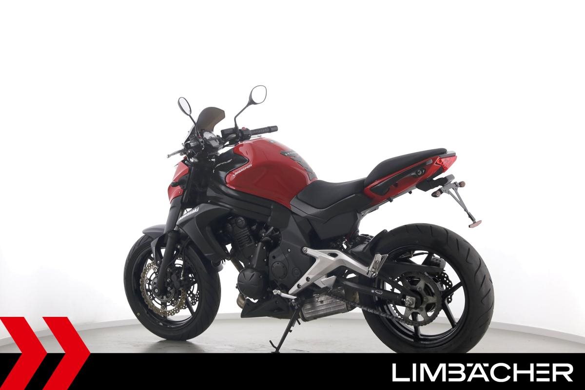 Eine scheckheftgepflegte Kawasaki ER-6n in gepflegtem Zustand u.a. mit kurzem Kennzeichenhalter sowie Ganganzeige.