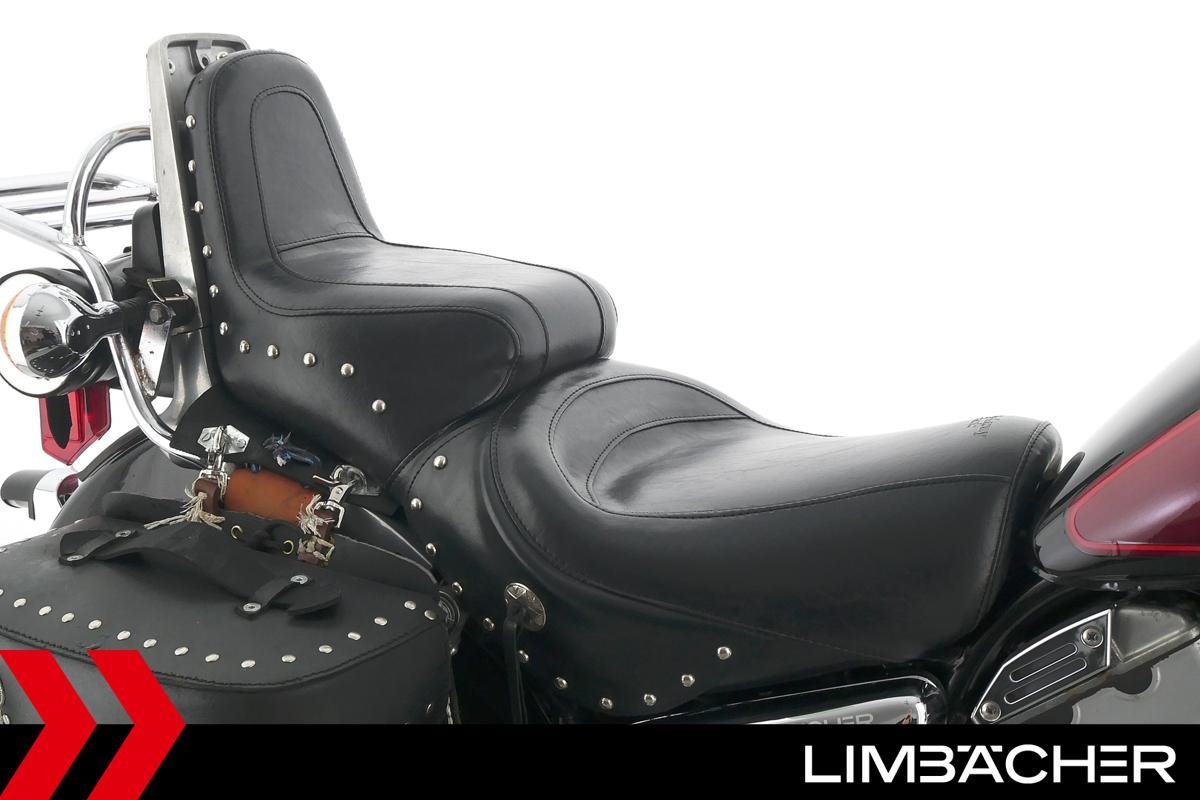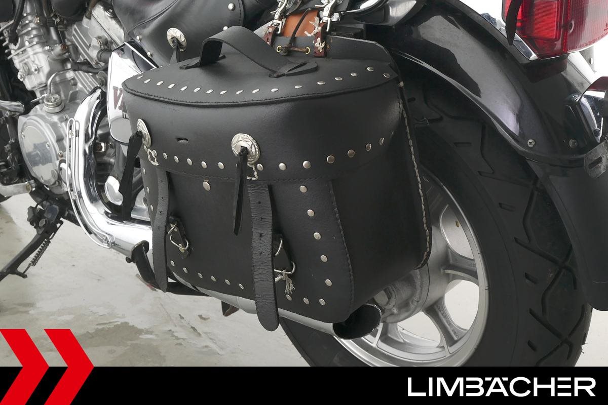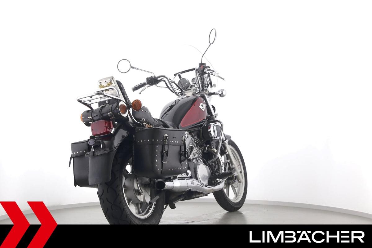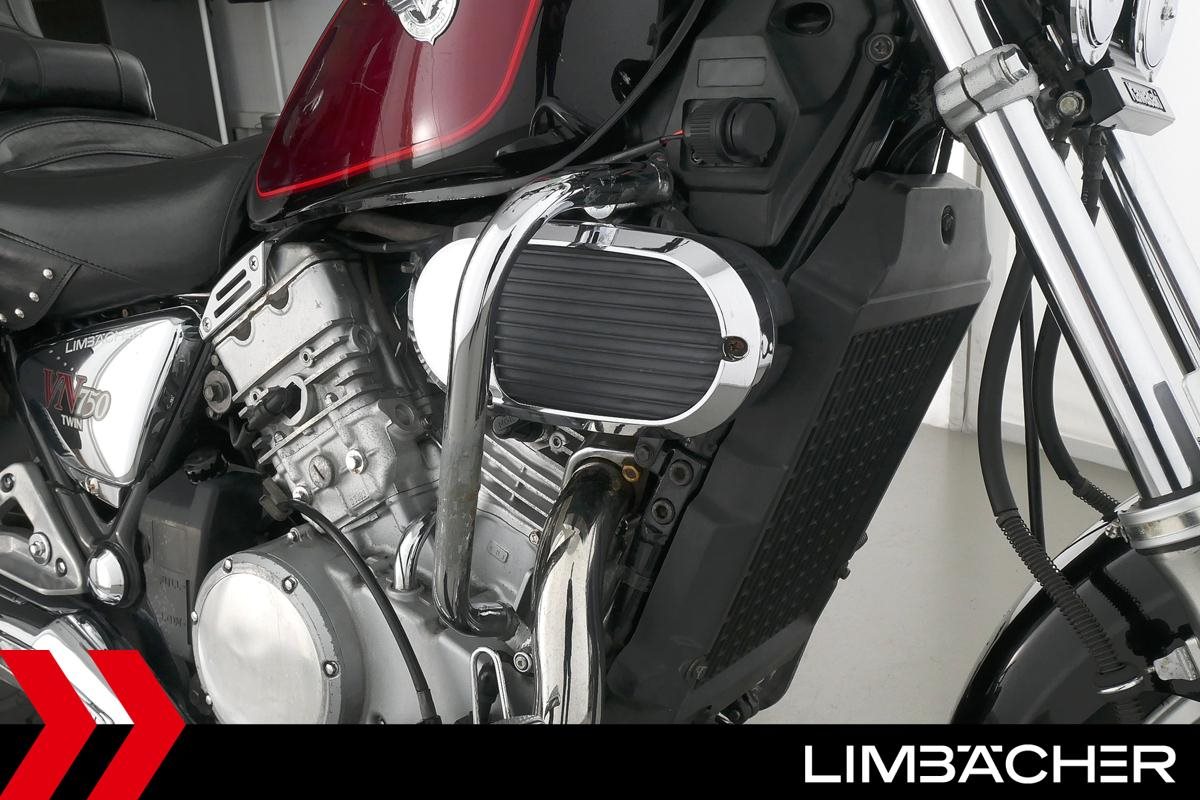 Eine Kawasaki VN 750 in gebrauchtem Zustand u.a. mit Windschild und Sturzbügel.