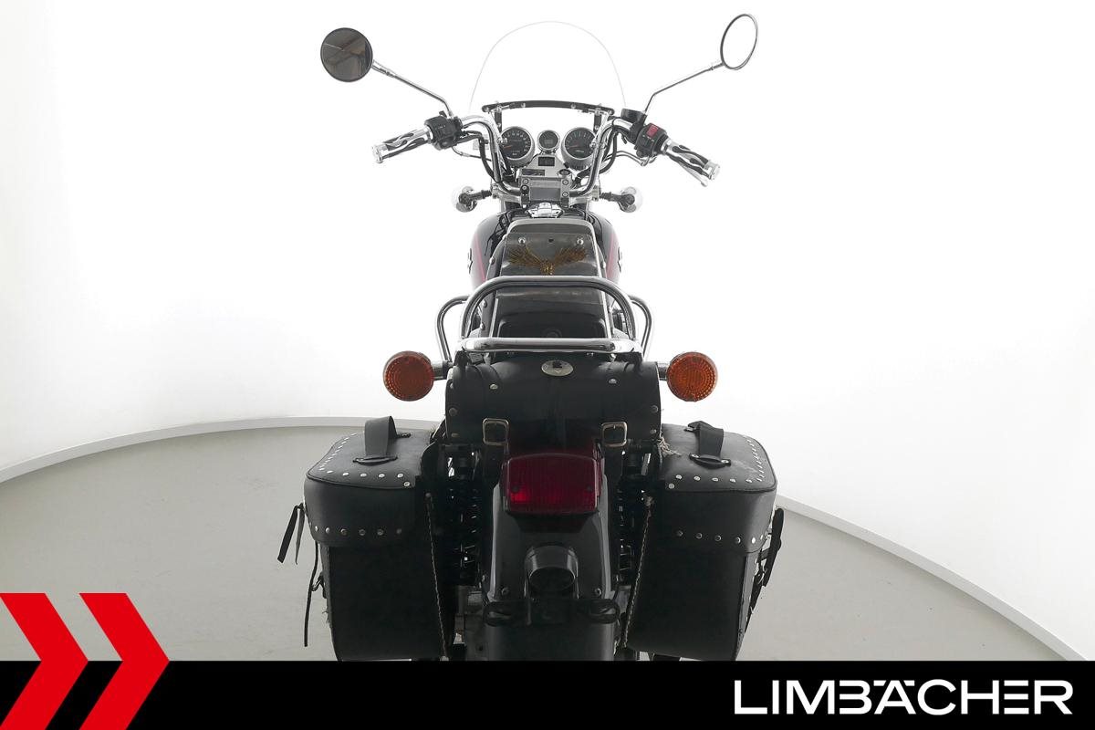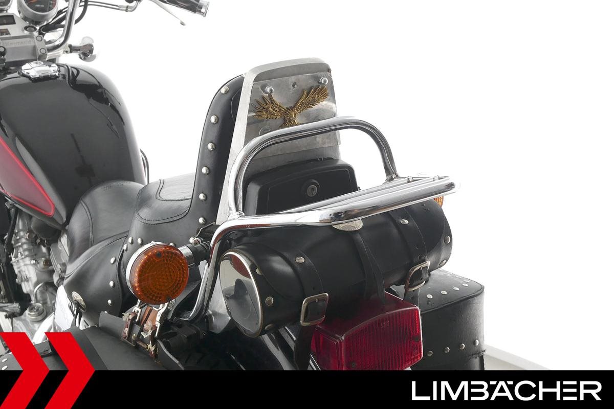 Eine Kawasaki VN 750 in gebrauchtem Zustand u.a. mit Windschild und Sturzbügel.